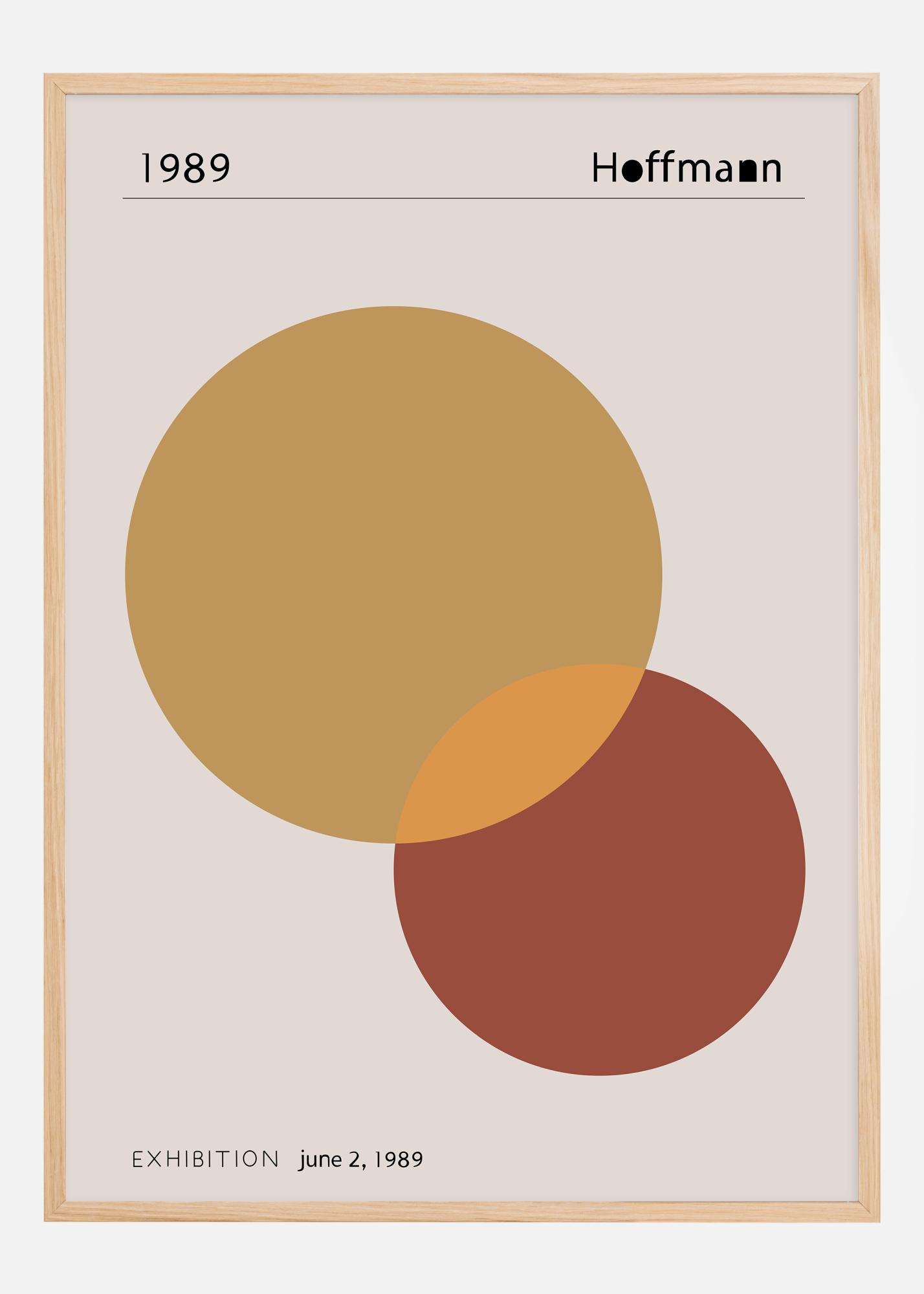 Ez a minimalista és kifinomult poszter a Hoffmann absztrakt művész 1989-es kiállítását ünnepli. Egy letisztult dizájnnal, amely átfedő köröket ábrázol meleg barna és okker tónusokban, ez a plakát egyszerre teremt retro és modern érzetet. A szöveg diszkréten van elhelyezve, hogy teret adjon a vizuális elemnek, ahol minden elem gondosan kiegyensúlyozott, hogy hangulatos és hívogató műalkotást hozzon létre.