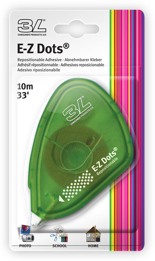 Nem állandó fotószalag a 3L-től. A szalag apró, lila színű, öntapadó pöttyökből áll. A színe miatt könnyű látni a pöttyöket és eltávolítani, amikor elkészültél. Egy tekercs 10 méter szalagot tartalmaz 9 mm szélességben.