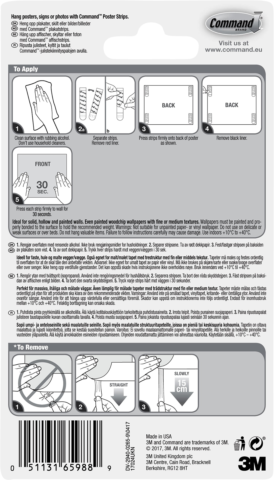 A Command Poster Strips gyors és kényelmes megoldás a poszterek, naptárak és más könnyű tárgyak biztonságos felakasztásához. A felakasztószalagok könnyedén rögzíthetők a falra, és a legtöbb sima felületen használhatók, például festett falakon, festett tapétán, csempén, fémen és fán. Nem ajánlott használni festetlen tapétán, viniltapétán vagy érzékeny felületeken.
