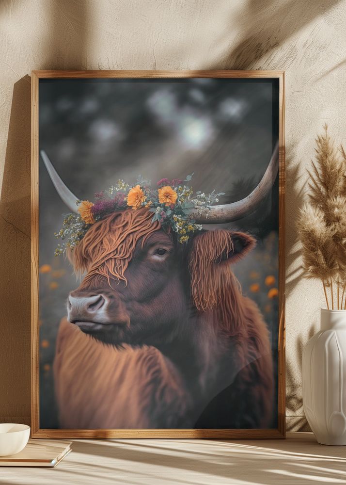 Highland Cow With Flowers Poszter