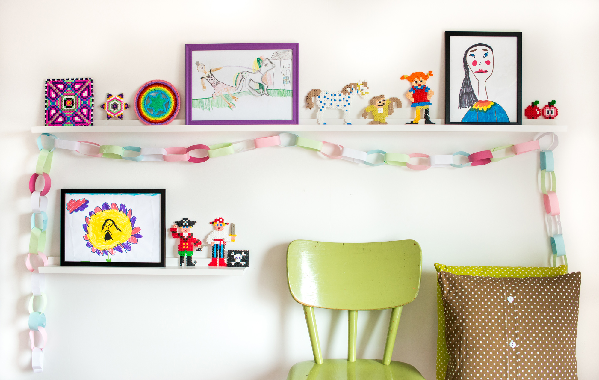 A képen gyöngytáblákat és girlandokat használtunk – valami, ami nagyon jól illik egy gyerekszobába, ahol szeretjük, ha kicsit gyerekes és játékos. Ha a képkeretpolcodat a saját hálószobádban, vagy esetleg a nappalidban tartod, valószínűleg egy kicsit szigorúbb belső stílust szeretnél tartani.