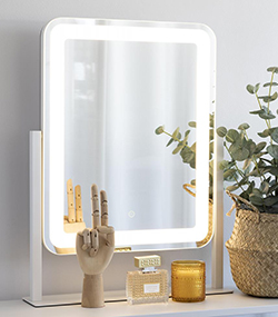 A tükrökbe integrált LED világítás LED diódákból áll. Ezek nem cserélhetők, de élettartamuk megegyezik a tükör életciklusával. Ez sok, jól megvilágított sminkórát ígér! 50 000 óra elteltével a fényerőt körülbelül az eredeti erősség 50%-ára becsülik. A LED világítás 2800-3000K közötti fényt nyújt, amely melegfehér színhőmérsékletet jelent. A Kelvin mérési skála 1000-től 10 000K-ig terjed, ahol az alacsonyabb érték melegebb színhőmérsékletet jelent, és a magasabb érték hideg fényt jelent. A 2500-3500K közötti tartományban a fény melegebb és sárgás fényt nyújt. Ez ideális otthoni környezetben, mivel megszoktuk a hagyományos izzókat és halogénlámpákat. Ez a fény tökéletes a sminkeléshez és ígéretet tesz arra, hogy tökéletes megjelenést biztosít minden nap!