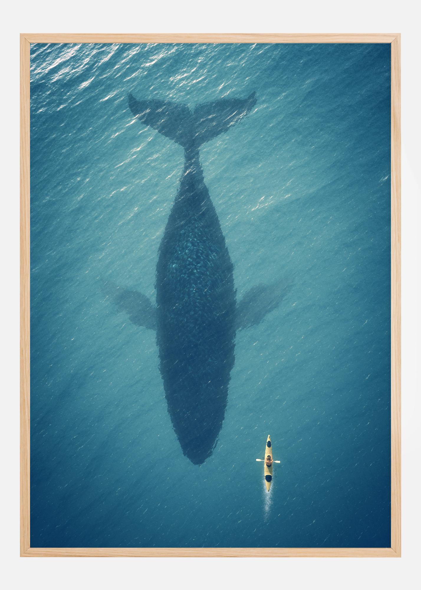 Ez a lenyűgöző poszter egy pillanatfelvételt rögzít egy kajakozóról és a méltóságteljes bálna sziluettjéről, amely éppen a csillogó tenger felszíne alatt tűnik fel. A kis jármű és az óriási bálna közötti kontraszt erőteljes érzést kelt a természet grandiózus méreteiről, miközben a kék színpaletta nyugalmat és a tenger ismeretlen mélységét közvetíti.