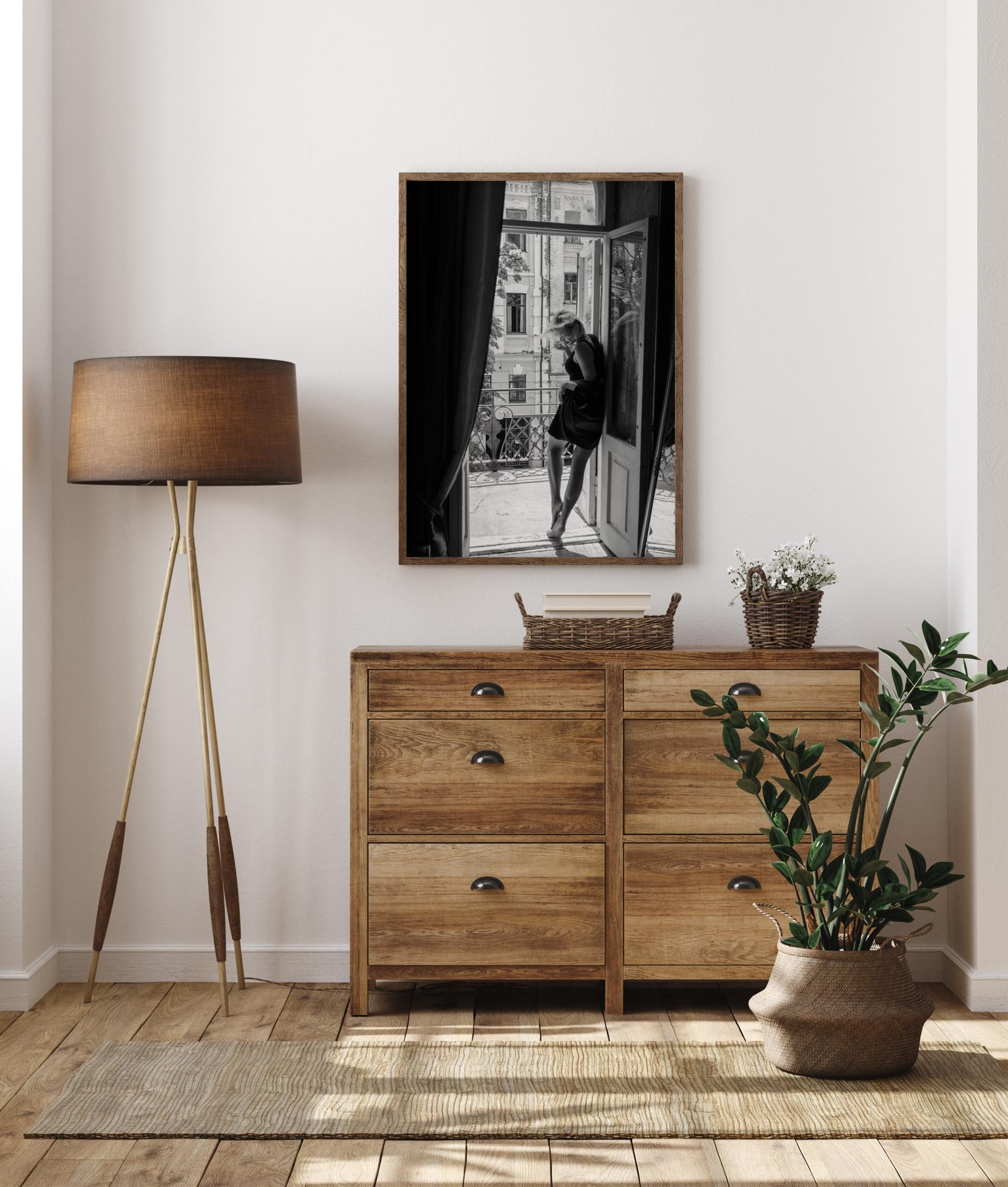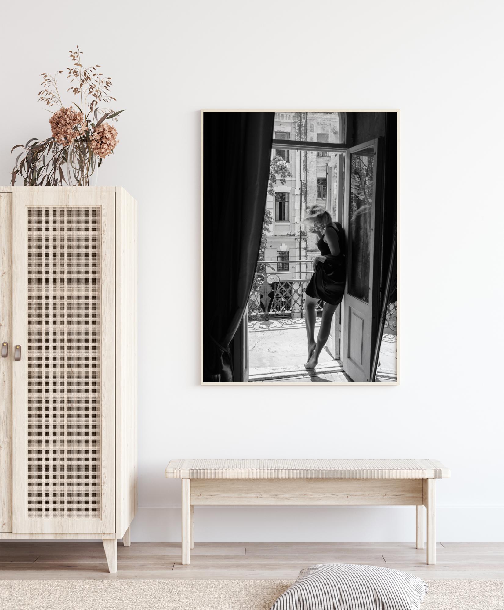 Egy klasszikus poszter egy nőről, aki egy párizsi erkélyen áll. A nő fekete ruhát visel, amely meghosszabbítja mezítelen lábait, miközben egy ajtónak támaszkodik, lábujjhegyen állva, és a lábaira néz. Kombinálja ezt a fekete-fehér posztert egy világos színű fallal, hogy előhozza az elegancia érintését.