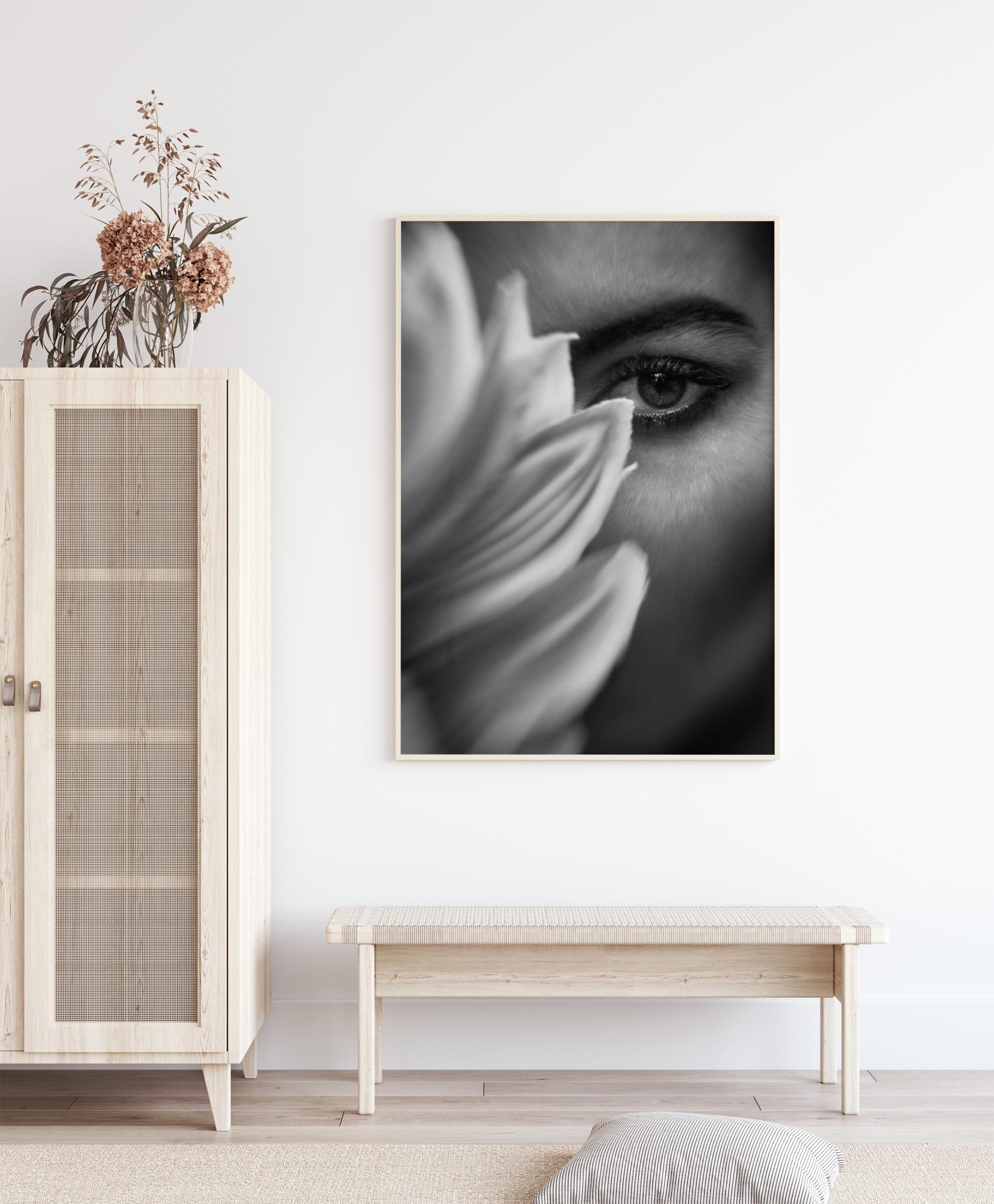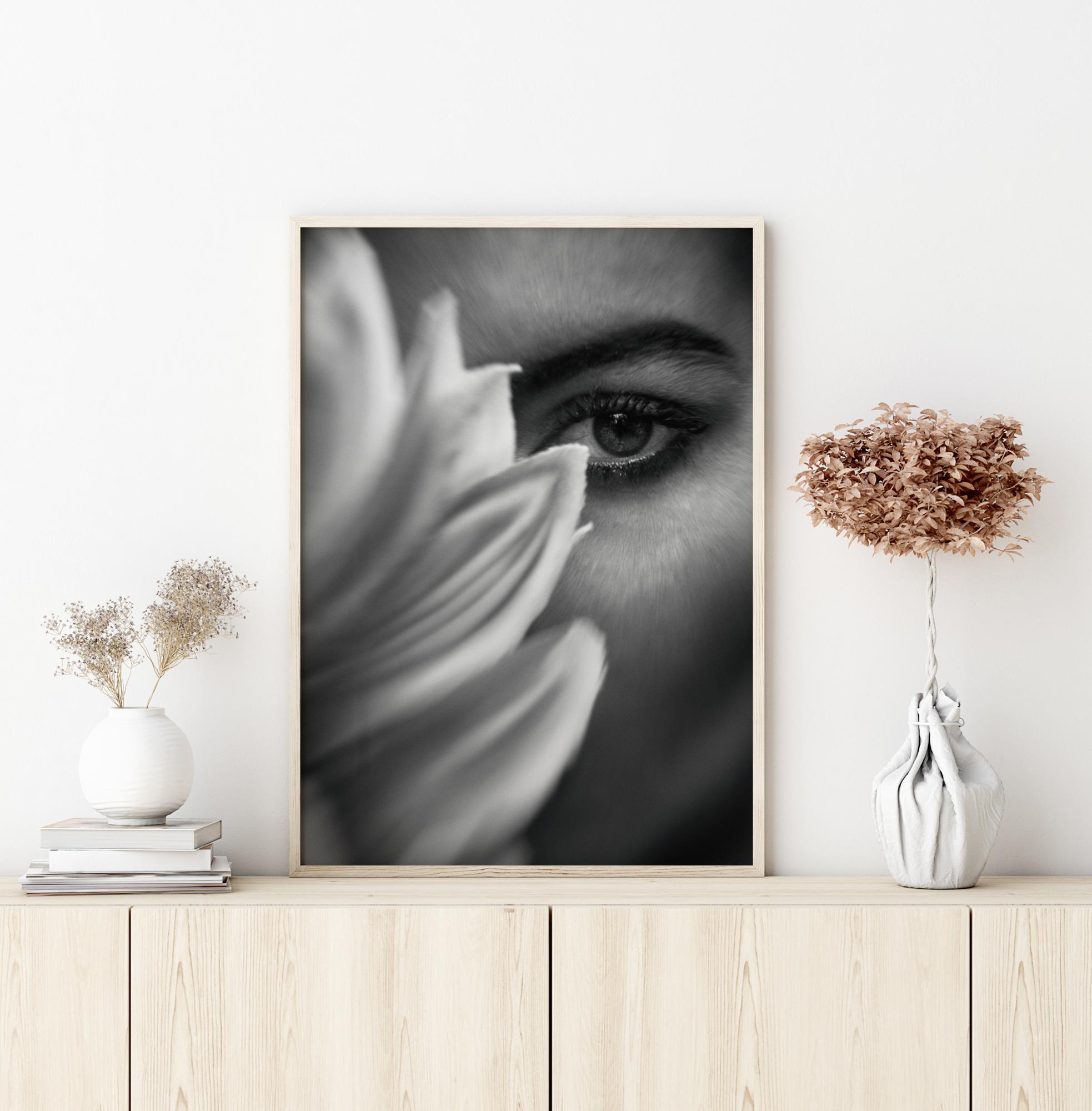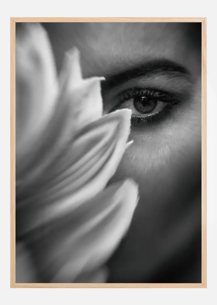 Egy fantasztikus poszter egy virággal és egy női szemmel közelről. A lágy fekete-fehér tónusok kiemelik bármilyen színnel szemben. Változtasson bármelyik szobát egy lelki szemlélődés békés helyévé.