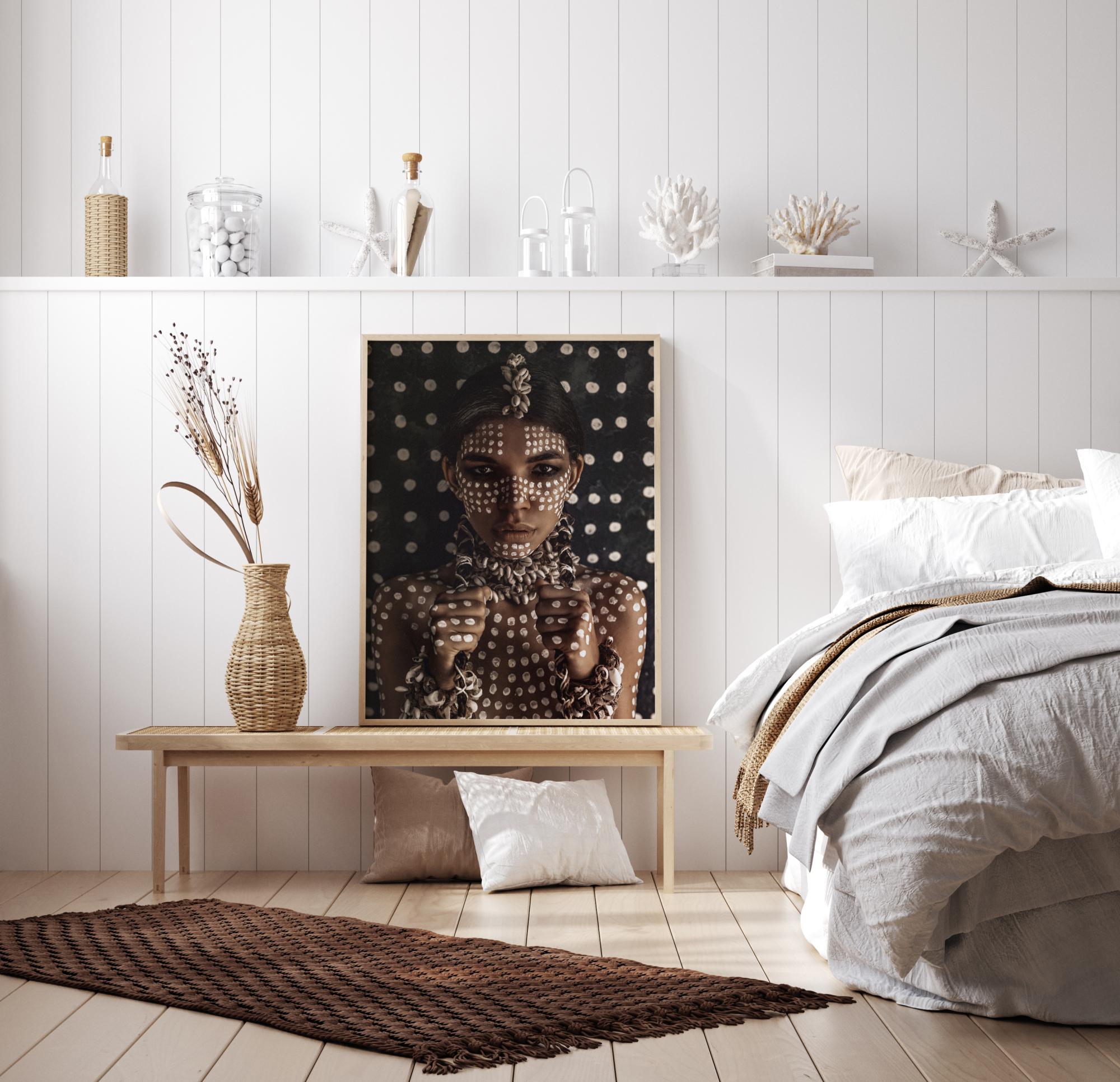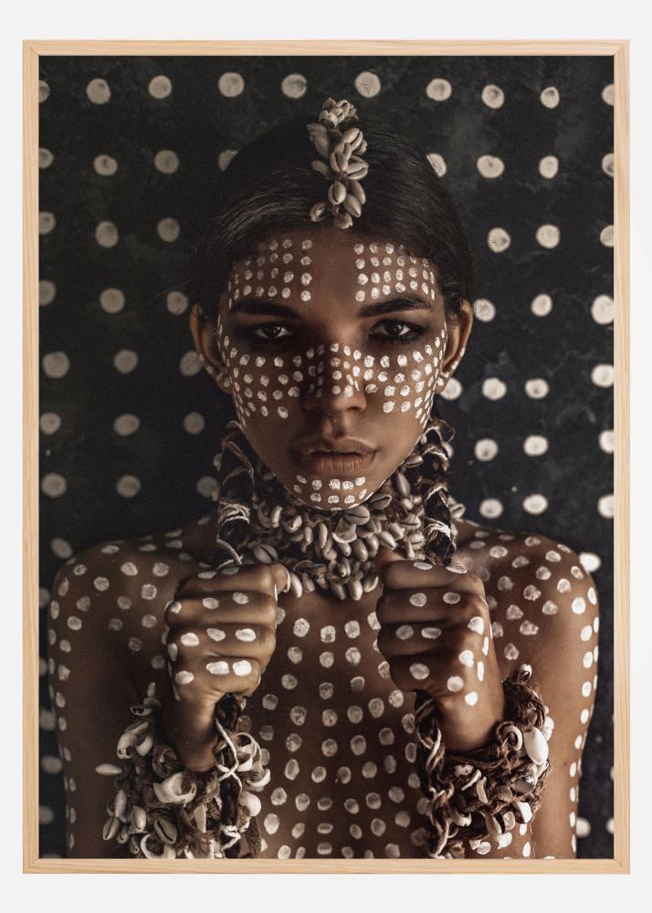 Itt találkozhatsz egy fiatal női őslakos erős tekintetével, akinek teste fehér festéssel díszített, és gyönyörű ékszerei természetes zsinórból és kagylókból készültek. Egy földhözragadt fotóművészeti poszter, amely egyaránt jól mutat magányos pompában és a modern kép falán.
