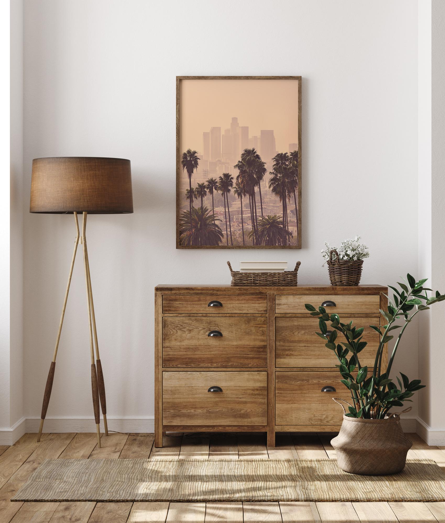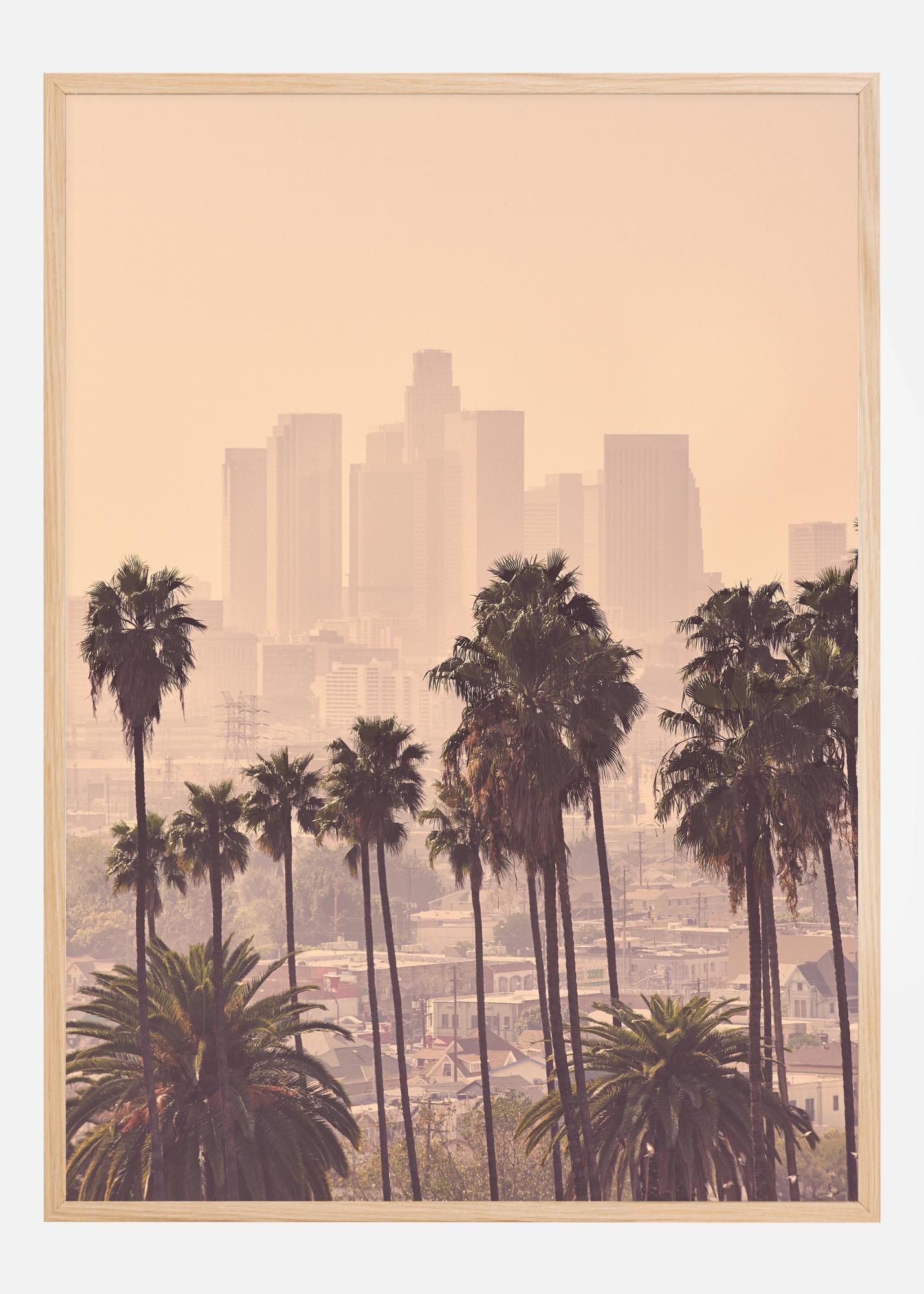 Egy poszter, amely egy városi tájat ábrázol rókapálmafákkal az előtérben és egy város sziluettjével a háttérben. A pálmák éles fókuszban vannak, a háttérben lévő ködös felhőkarcolók pedig a természetre irányítják a figyelmet. Érezheted a városi élet auráját ebben a kifejező szeppi színű műben.
