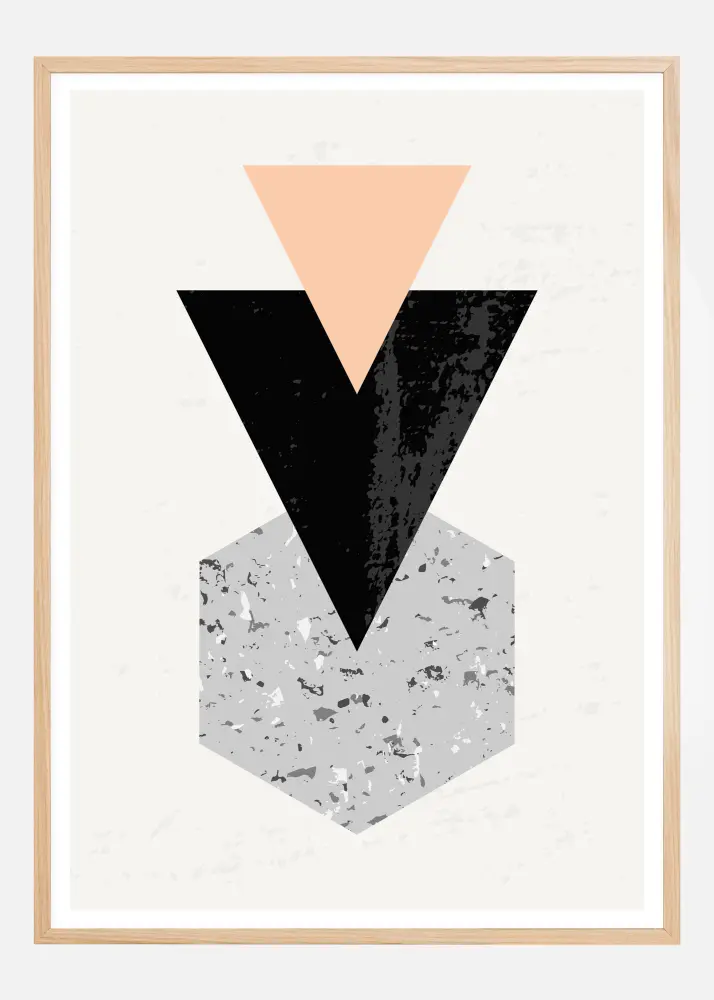 Egy háromszög alakú geometrikus poszter élénk, merész formákkal. A két rózsaszín és fekete háromszög lefelé mutat, ami a szemet a lágyabb kék és szaggatott kockához vezeti. A középen elhelyezett fekete háromszög tartja a fókuszt, ami tökéletessé teszi ezt a bemutatást az otthoni irodában, a kevésbé zavaró dizájnjával, amely minden szobával kompatibilis.