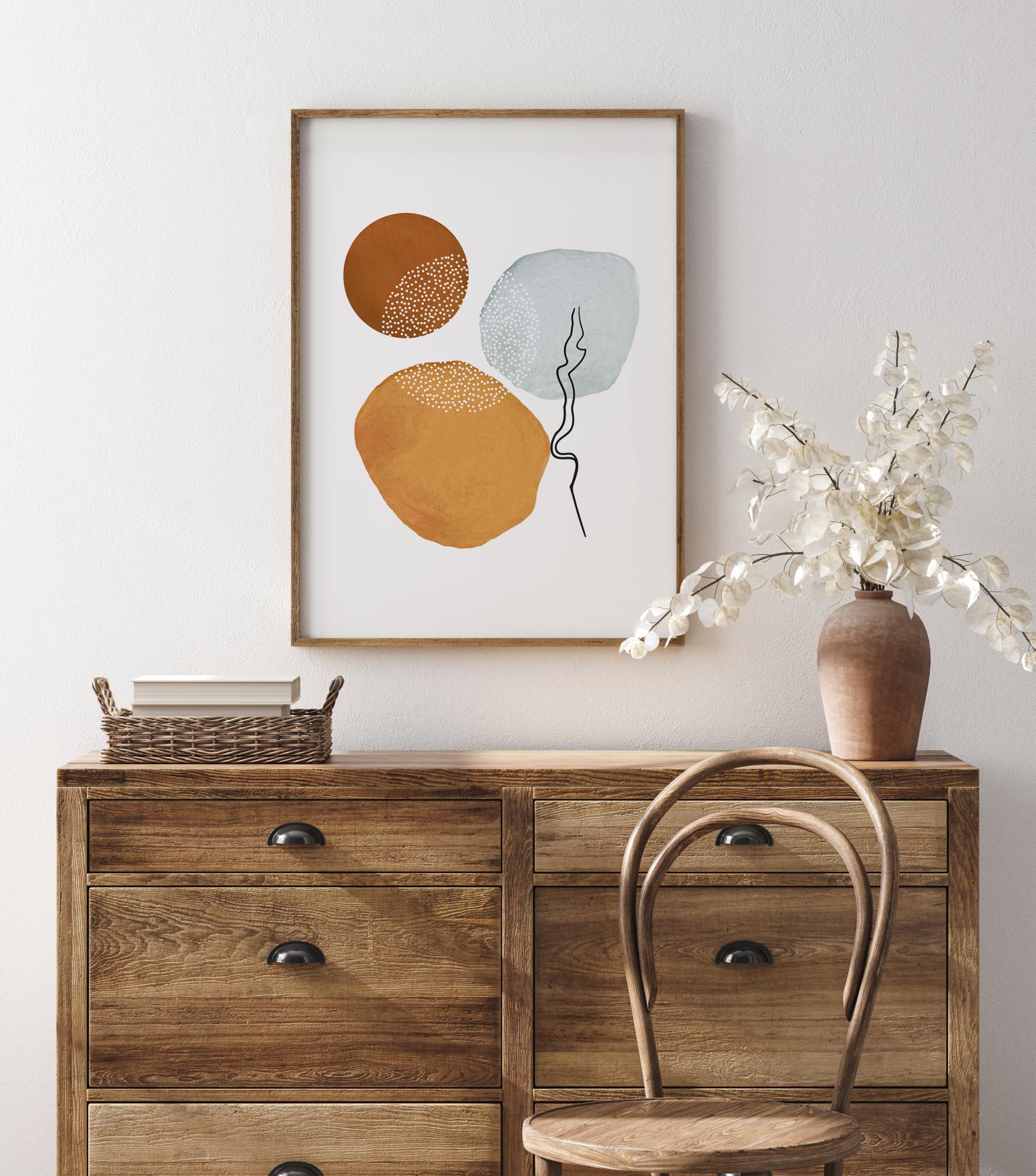 Egy egyszerű absztrakt poszter három fő kör alakú formával. E három forma felett átfedő kör található, amely kisméretű fehér pöttyökből áll, hasonlóan egy pitypangórához. Két egyszerű vonal kígyózik át a kék formán, és összefogja a művet egy egésszé. Ez a nyomat kiváló kiegészítője egy kifinomult galerifalnak.