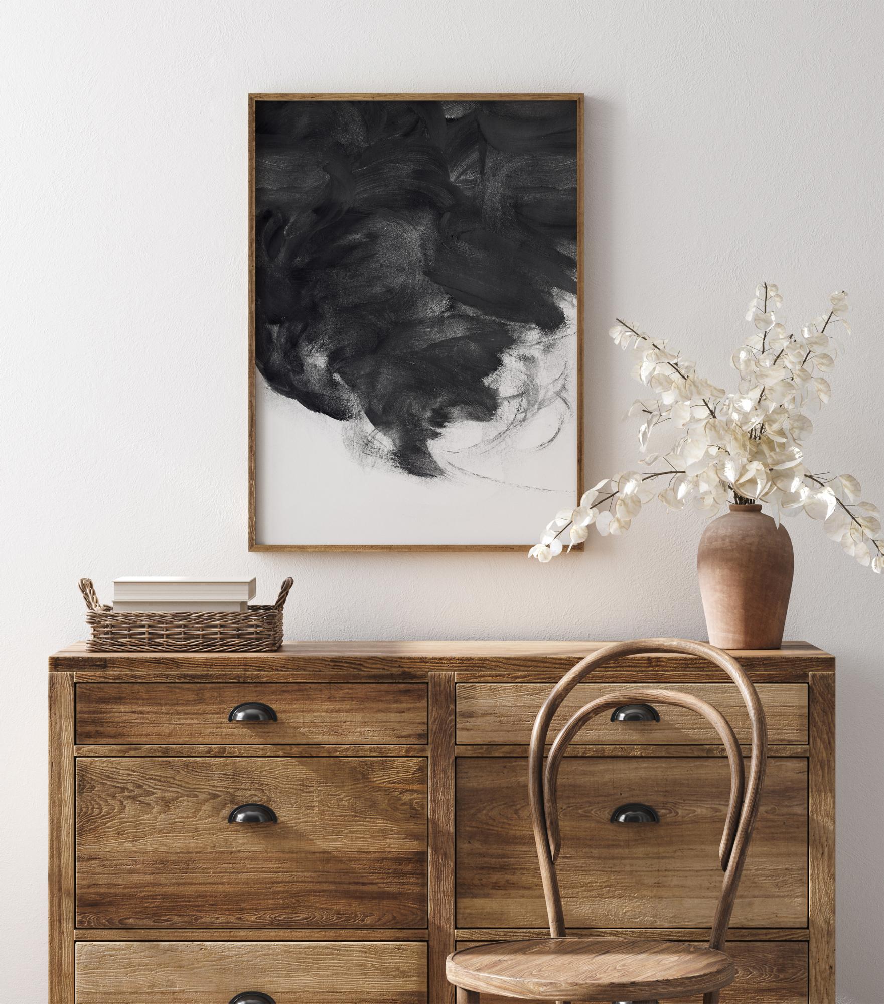 Egy absztrakt poszter egy fekete spirálról. Ez a lenyűgöző fekete-fehér alkotás a tekintetet a tetejéről a közepébe vezeti a fekete spirálon keresztül. Ahol a fekete találkozik a fehérrel, elképzelhet egy barlangot, egy vihart vagy egy felhőt ezen a dinamikával teli poszteren. Helyezze ezt egy világos falra egy drámai és epikus érzésért.