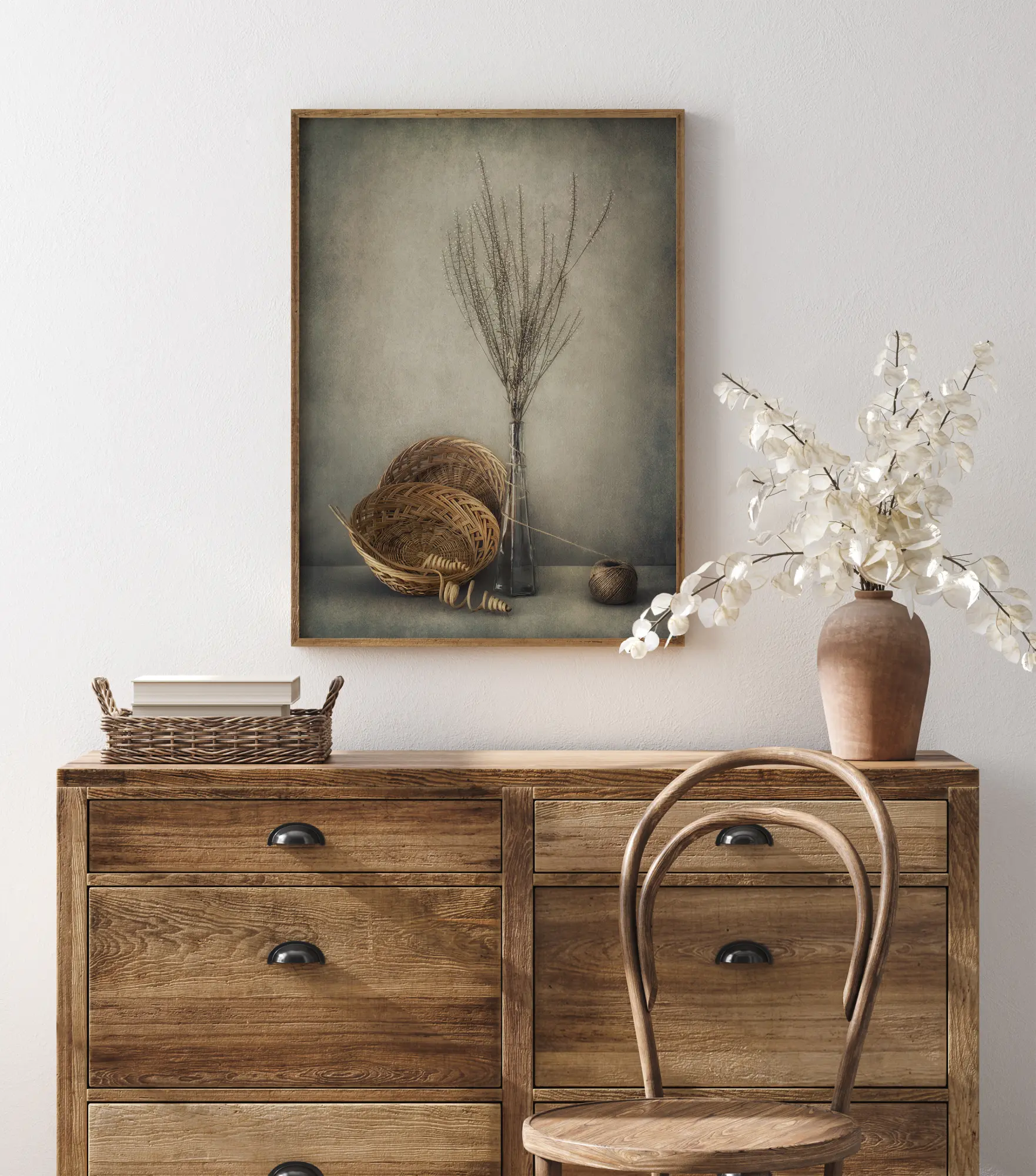 Egy csendélet poszter kosarakkal, egy agyagedénnyel és egy üvegpalackkal szárított fűvel. Ez a mű finom szépia- és szürkeárnyalatokkal rendelkezik, amelyek lágy és harmonikus művet alkotnak. Csempésszen egy kis nyugalmat az otthonába ezzel a poszterrel, és párosítsa semleges színű fallal, hogy ne vegye át túlságosan az irányítást.
