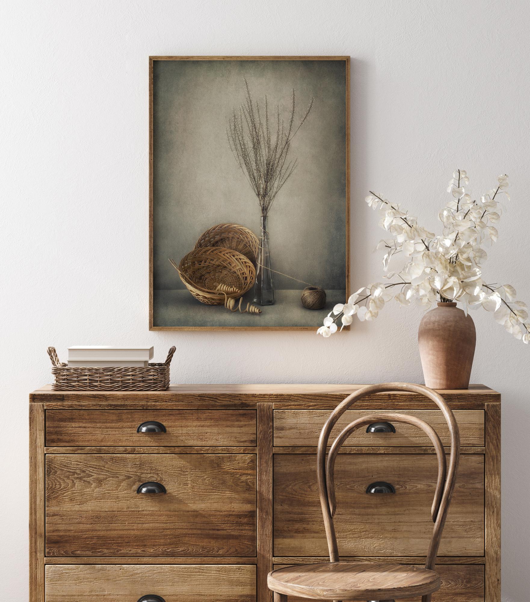 Egy csendéletplakát kosarakkal, egy agyagedénnyel és egy üvegpalackkal, szárított fűvel. Ez a mű lágy szépia- és szürkeárnyalatokat tartalmaz, amelyek egy puha és harmonikus alkotást hoznak létre. Hozzon egy kis nyugalmat az otthonába ezzel a plakáttal, és kombinálja semleges falakkal, hogy ne vegye át túlságosan az uralmat.