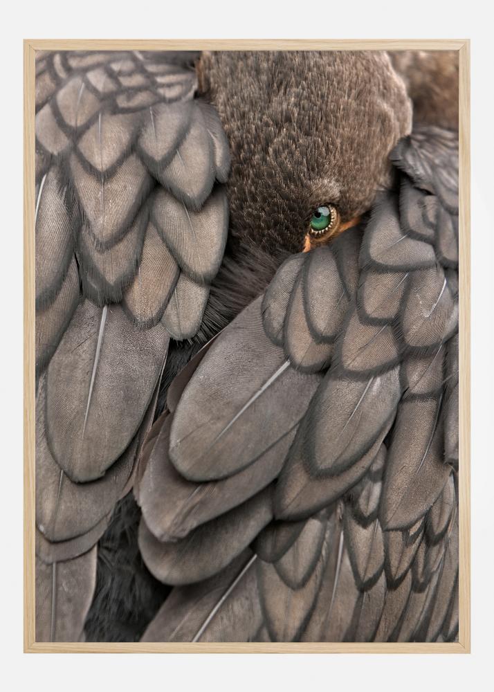 Ez a lenyűgöző poszter egy madár közeli képén keresztül ragadja meg a természet intimitásának pillanatát, ahol ragyogó zöld szeme úgy tündököl, mint egy smaragdzöld a tollak szürke árnyalatai között. Minden toll precízen van megformálva, ami a madár elegáns formáját és szerkezetét idézi elő. Ez egy műalkotás, amely megszólítja mind a madárkedvelőket, mind a művészeket, és azokat is, akik értékelik a természet finom szépségét.