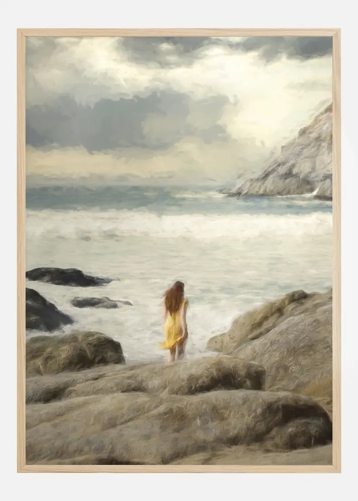Csillapítsd le elméd és hagyd, hogy elvezessen a nyugalom helyére lenyűgöző poszterünkön keresztül, amely tisztelgés a tenger örök ritmusa és a természet csendes beszélgetései előtt. Ez a nyomat egy fiatal lányt ábrázol aranyszínű ruhában, ahogy a tengert figyeli a sziklák biztonságából. Vörös haja lobog a szélben, és harmonikusan keveredik a táj lágy ecsetvonásaival, ami inkább egy festmény, semmint egy fotó érzetét kelti.