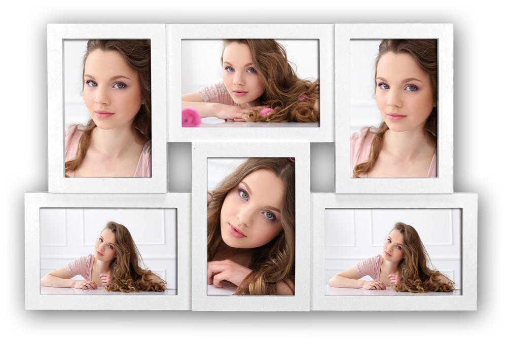 Modern fehér kollázs keret 6 kép számára, amelyeket mind fekvő, mind álló formátumban helyezhet el. Tökéletes, ha személyes fotókollázst szeretne készíteni, amelyet a falra akaszthat.