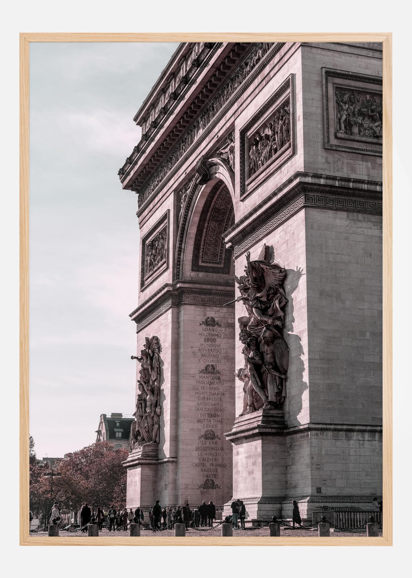 Ez az elegáns poszter a párizsi Diadalív impozáns és részletgazdag építészetét emeli ki. Ebben az egyedülálló nyomatban megörökítik a híres nevezetesség nagyságát és gazdag részletvilágát, a pilléreket díszítő hatalmas szobroktól kezdve a finom díszítéseken és feliratokon át, amelyek történelmi jelentőségéről mesélnek. Egy enyhe rózsaszín árnyalattal, amely meleg légkört teremt, ez a kép tisztelgés a francia történelem és építészet előtt, és művek és poszterek bármely gyűjteményének kultivált kiegészítőjévé válik.