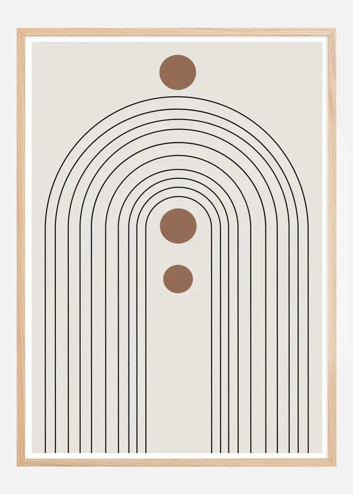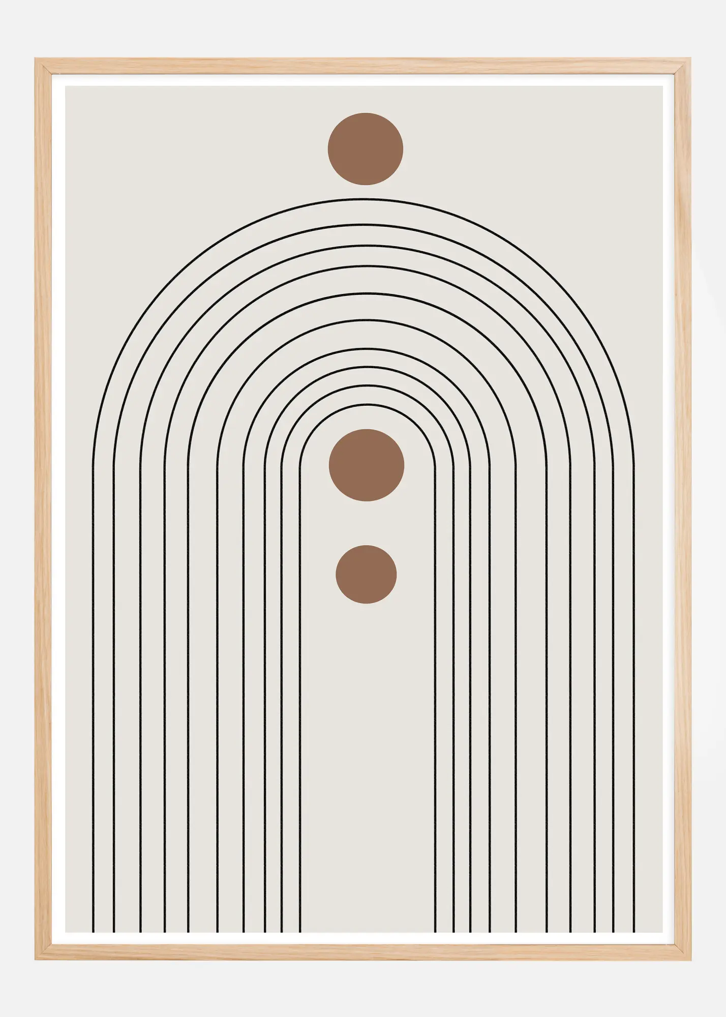 Ez a grafikus poszter stilizált boltíves motívumot ábrázol, amely leegyszerűsített formában idézi meg a monumentális építészet érzetét. A fekete vonalak félkör alakú mintázatot alkotnak, ami dimenzió és mélység illúzióját kelti, miközben az elhelyezett barna körök organikus kontrasztot adnak a máskülönben szigorú geometriához. Ez az absztrakt mű egyszerre feszes és játékos, harmonikus egyensúlyban tartva a görbéket és a lineáris elemeket.