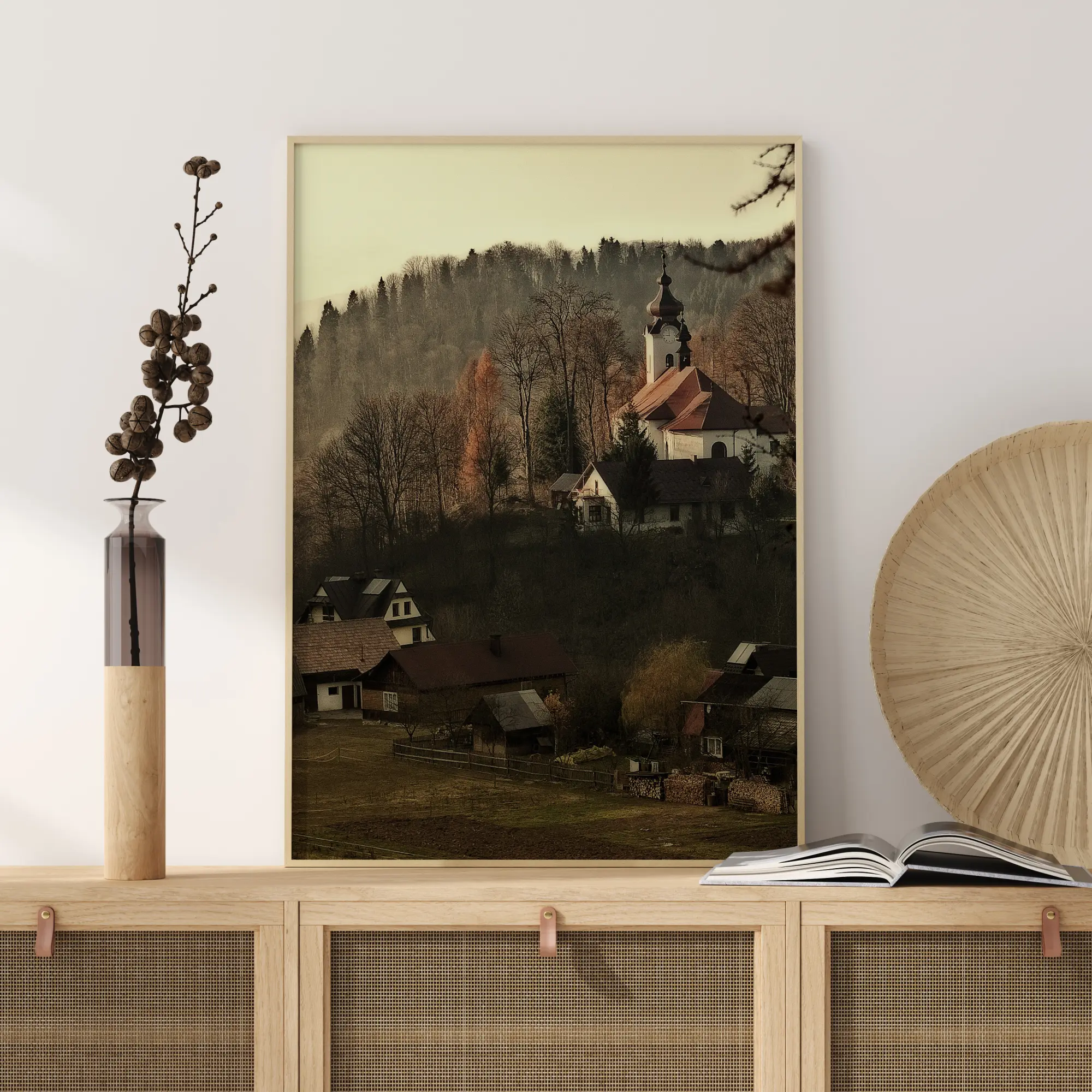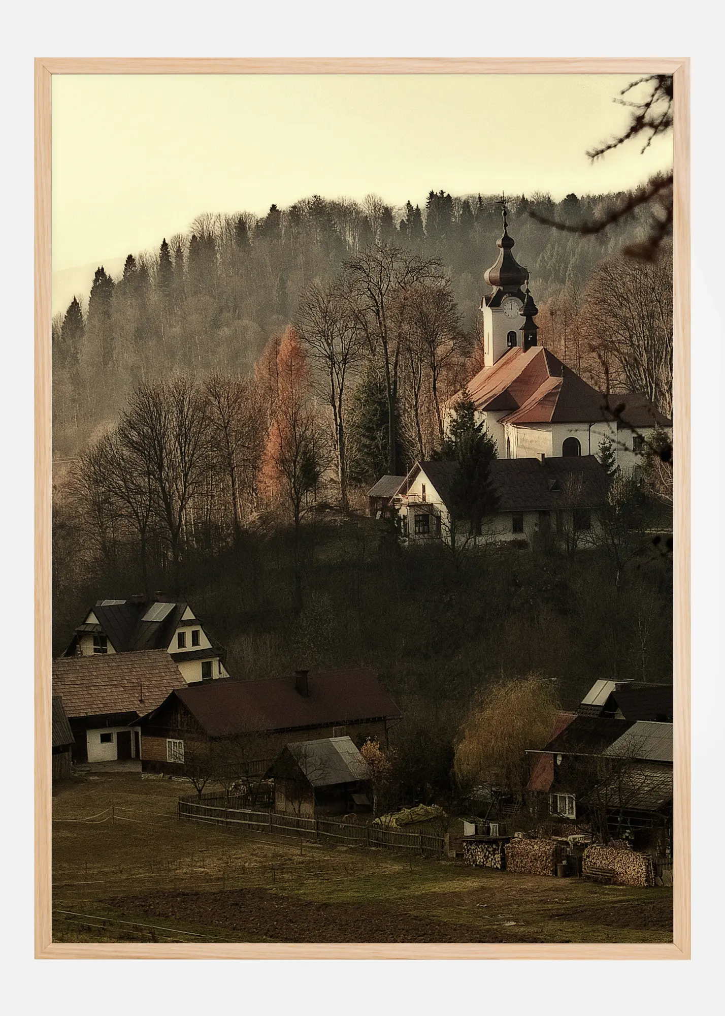 Egy városképposzter egy kis faluról a vidéken, régi házakkal és mezőkkel, mögöttük erdős dombokkal. Egy fehér templomtorony magasodik a táj tompa barna és zöld színei fölé. Merülj el saját képzeletedben ezzel a festői falusi képpel, ahogy felakasztod a posztert a falra.
