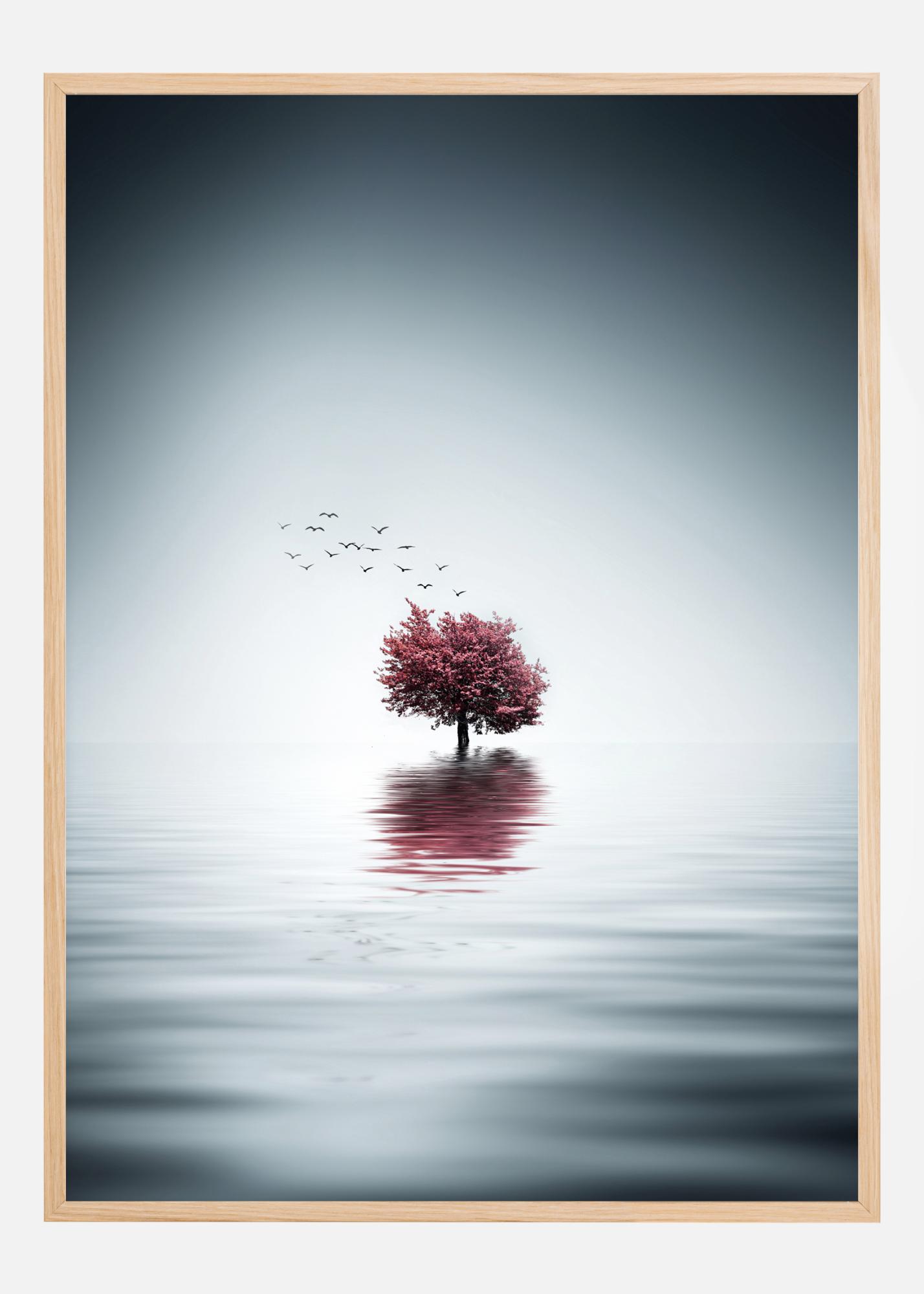 Egy egyszerű természetposzter egy tóval, amelynek közepén egy magányos fa áll. Az élénk színek és a fodrozódások a tekintetet a rózsaszín virágokkal borított kis cseresznyefára irányítják. Madárcsapat repül el egy fényudvarban. Igazán érezheted a természet misztikumát ezen a képen.