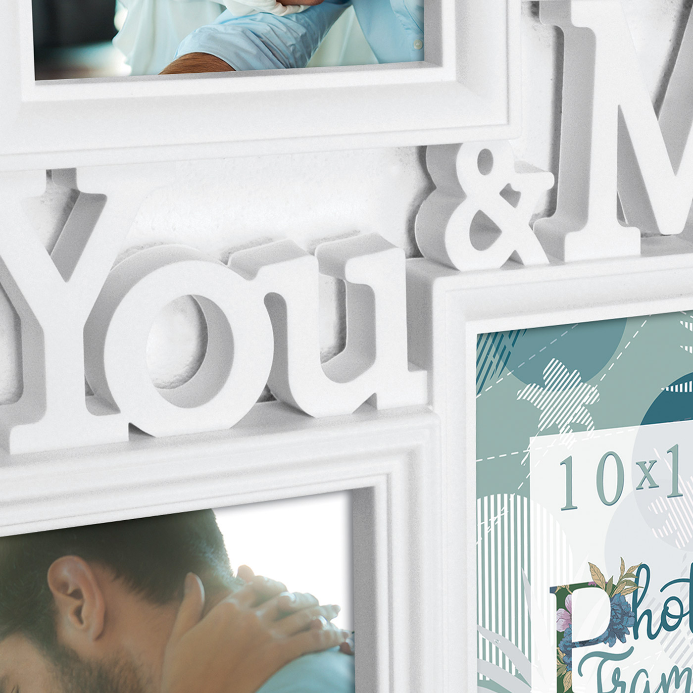 Ez egy szép kollázskeretes képkeret, amely 6 kép számára kínál helyet álló és fekvő formátumban. A középen a You & Me szavak olvashatók, talán szeretnéd bekeretezni a legjobb barátoddal készült szép fotókat ebben a keretben, vagy talán az élettársaddal készült képeket! Bárhogy is legyen, ez a keret tökéletes arra, hogy rendezz egy csoport szép emléket ábrázoló képet a hozzád közel állókkal. A kollázskeretes képkeret 10x15 cm-es képeknek felel meg. A keret egy elegáns fehér árnyalatú, és kompozit anyagból készült. Falra szerelhető. A külső méretek 47,5x38 cm.
