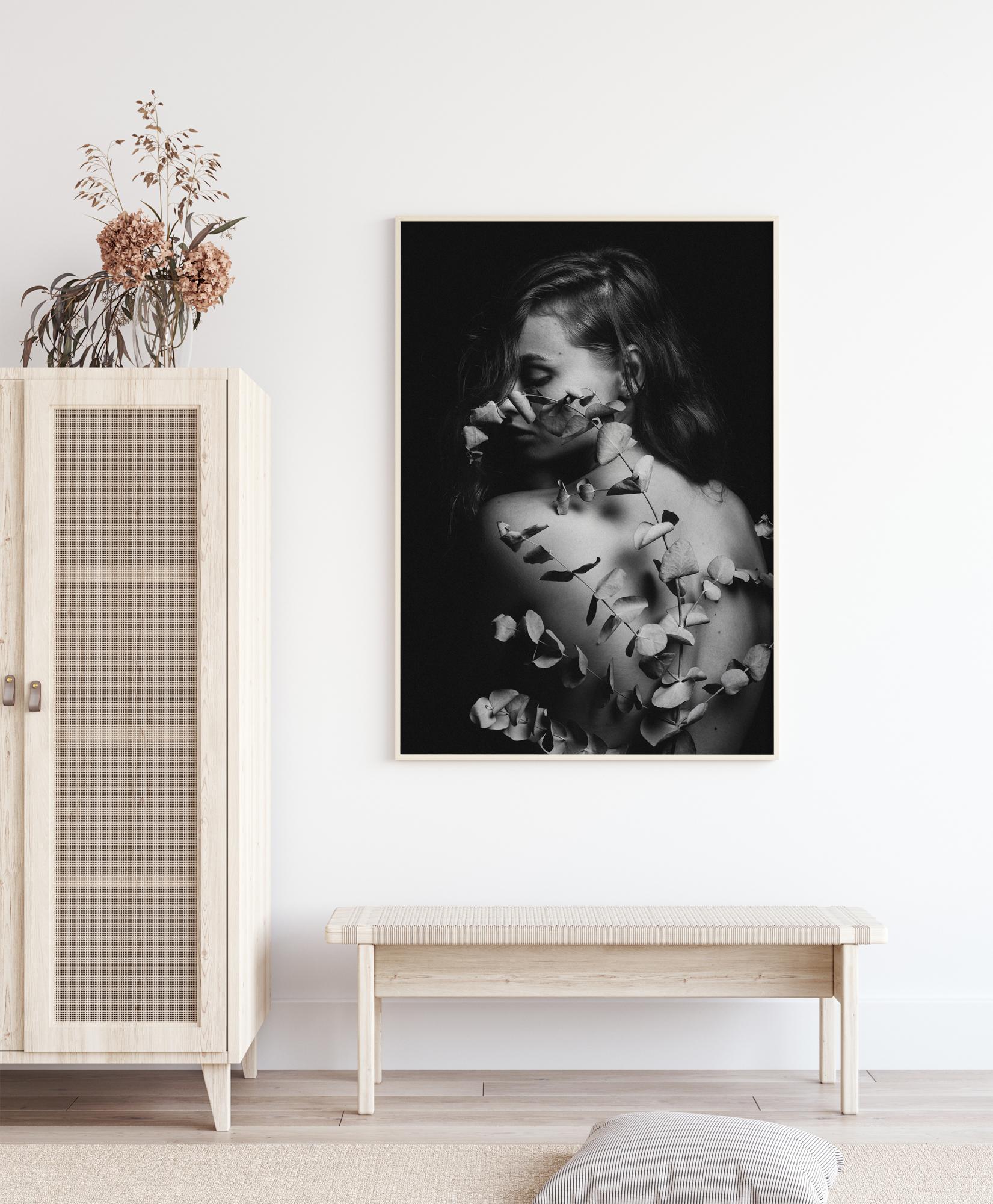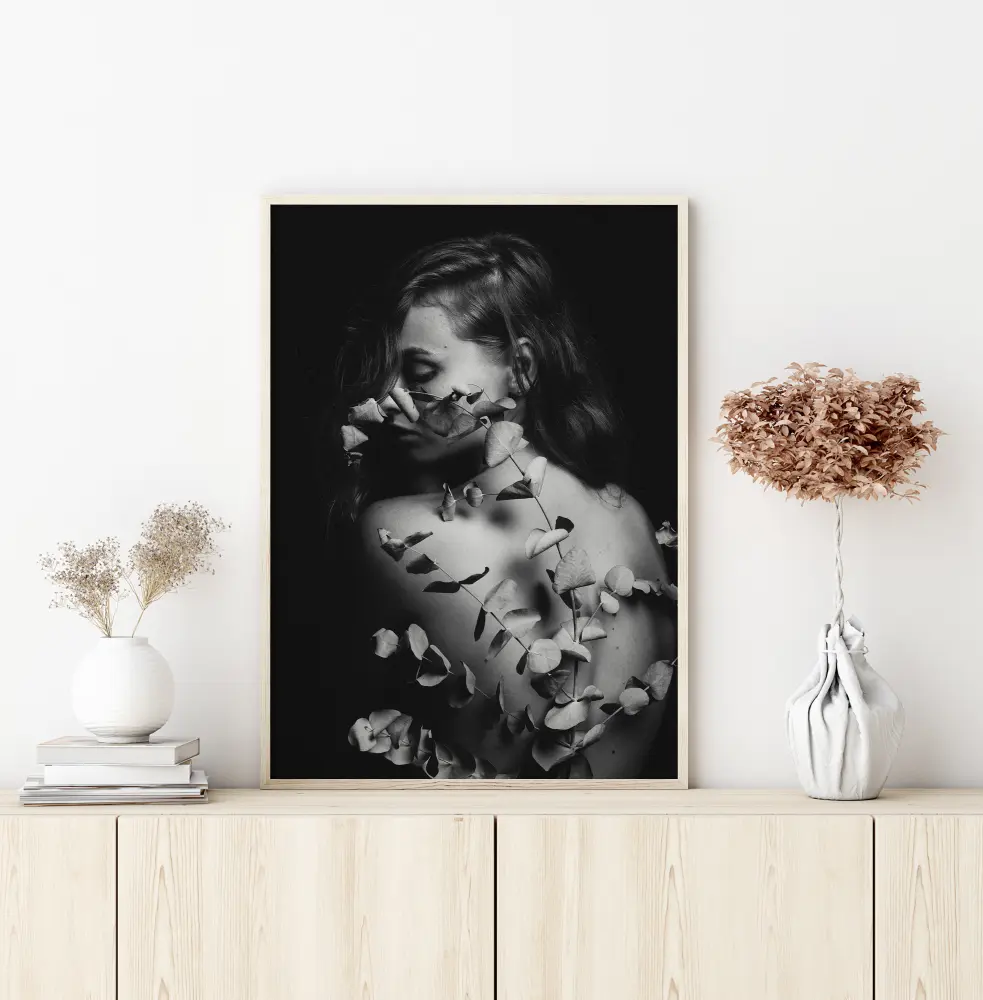 Egy gyönyörű poszter egy nővel, akinek levelek vannak a hátán. Kombináld ezt a fekete-fehér képet egy élénk faliszínnel, hogy drámai hatást érj el. Érezd a misztikumot és a békét, és vidd haza magaddal.