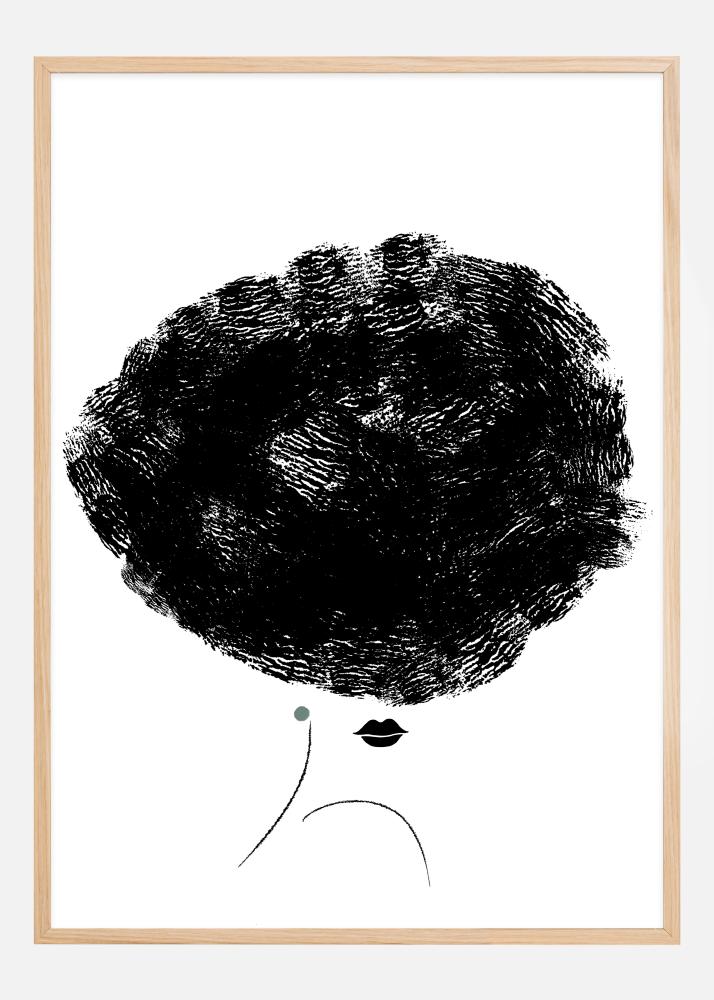 Ez a koncepcionális plakát egy minimalista, de kifejező női profilt ábrázol, ahol a nagy, volumetrikus haj uralja a jelenetet. A haj fekete, erőteljes és vastag ecsetvonásokkal van ábrázolva, amely drámai kontrasztot hoz létre a fehér háttérrel szemben, és egy dinamikus mozgás érzetét kelti, amely egy csendes pillanatban van megörökítve. Egy kicsi, diszkrét zöld pötty, amely a fül mellett helyezkedik el, megtöri a monokrómiát, és finom színes akcentust ad hozzá. Ez a nyomat kiemeli az alapvető formát és színt, és merész, modern esztétikát kínál bármilyen kortárs térhez.