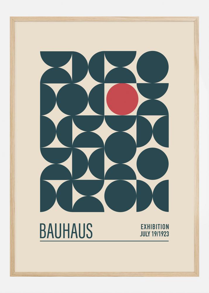 Ez a poszter a Bauhaus-mozgalom minimalista esszenciáját és annak geometria és szín hangsúlyát ragadja meg. A grafikai kompozíció különböző árnyalatú kék körök átfedéséből áll, kiegészítve egy hangsúlyos piros körrel, amely dinamikus és mégis kiegyensúlyozott vizuális élményt nyújt. A "BAUHAUS EXHIBITION JULY 19/1923" felirat utal a történelmi dizájniskola kiállításaira, melyek úttörőek voltak a modern dizájnban.