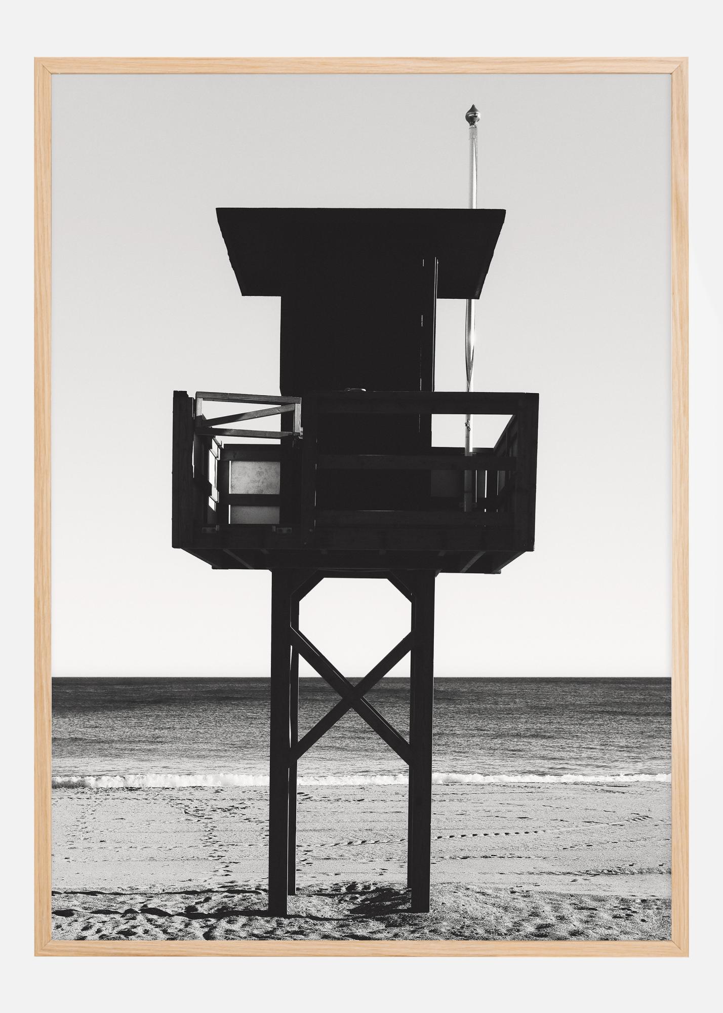 Ez a monokróm poszter egy ikonikus strázsatorony sziluettjét mutatja be egy tiszta égbolt és egy nyugodt tenger előtt. Az erős kontraszt a sötét strázsatorony és a homok valamint az ég világos tónusai között grafikai minőséget ad a képnek, amely egyszerre feltűnő és modern. A szemmagasságból készült fotó jelenlétet és nyugalmat kelt, mintha közvetlenül a parton állnánk, és tekintenénk ki a hatalmas tengerre.