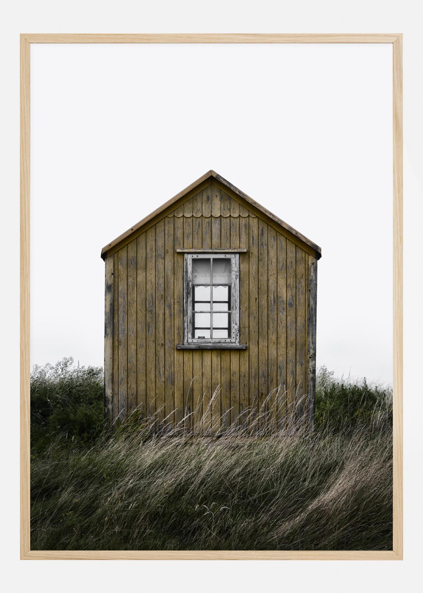 Elegáns tájképes poszter egy egyszerű fa tengerparti kunyhóval. Az elhagyatott kunyhó szélfútta homokdűnéken és fűben áll. Érezze azt a nyitottságot és szabadságot, amikor kitűzi ezt otthonában.