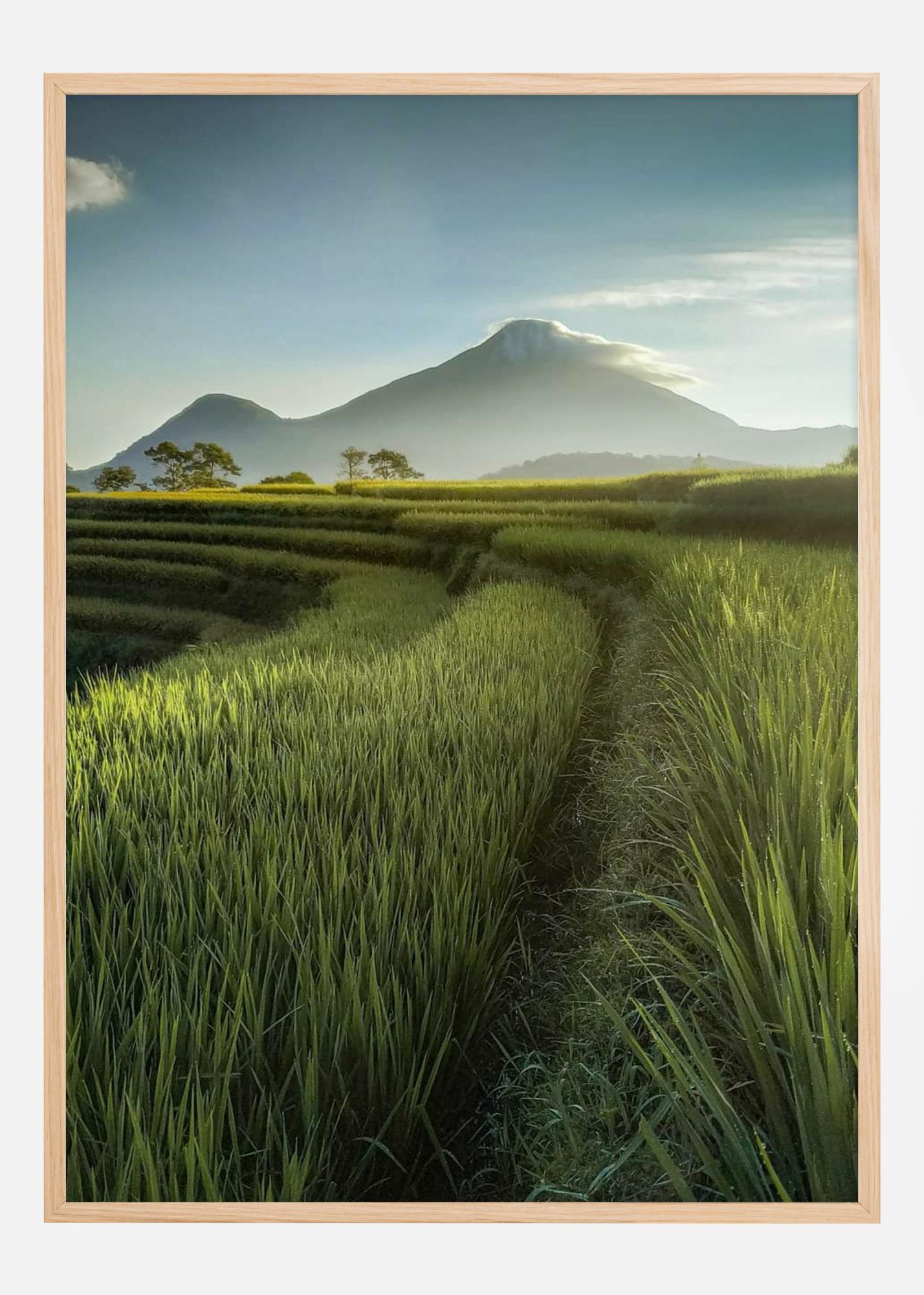 Ez a poszter egy pásztori idillt kínál, ahol zöld rizsföldek terülnek el a mögöttük megjelenő fenséges hegyek és a lágy égbolt hátterében. A tájra vetülő fény meleg és hívogató érzést kelt, így ez a nyomat tökéletes módja annak, hogy a természet nyugalmának és szépségének egy darabját vigyük otthonodba vagy munkahelyedre.