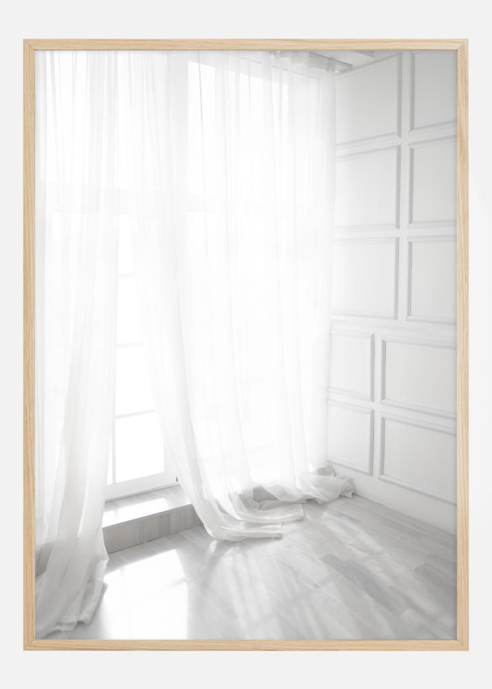 Ez a nyugodt és tisztító poszter egy szoba csendes sarkát ábrázolja, amelyet áttetsző fehér függönyök borítanak. A szöveten átszűrődő fény árnyékok és tónusok játékát hozza létre a fényes padlón, ami békesség és tisztaság érzetét kelti. Ez a minimalista nyomat a nyugalom kifejezése, és tökéletesen illene egy olyan környezetbe, amely egyszerűségre és nyugalomra törekszik.