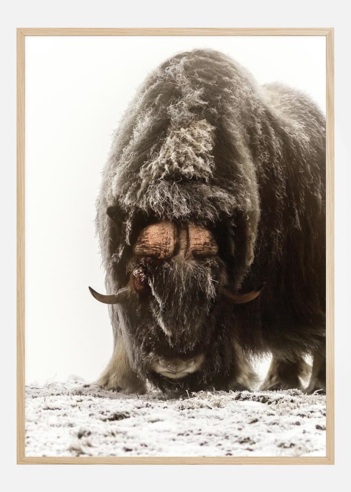 Egy vadonposzter egy hófödte jakról. A jak hosszú, barna szőre puha és buja, miközben a kamerával szemben áll, és ételt keres. A hófehér háttér kiemeli őt és drámai hatást kölcsönöz a képnek. Tegye fel ezt a falára, hogy téli hangulatot biztosítson.