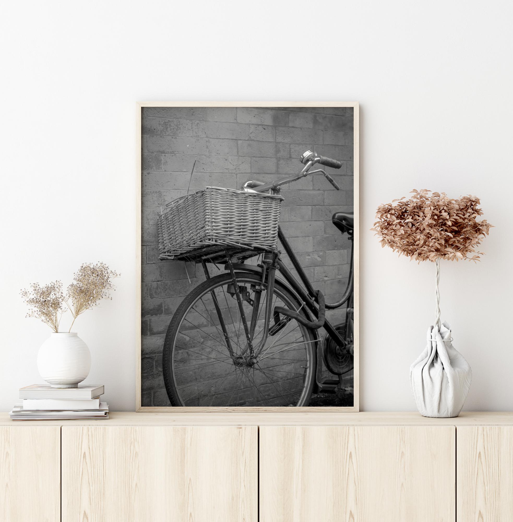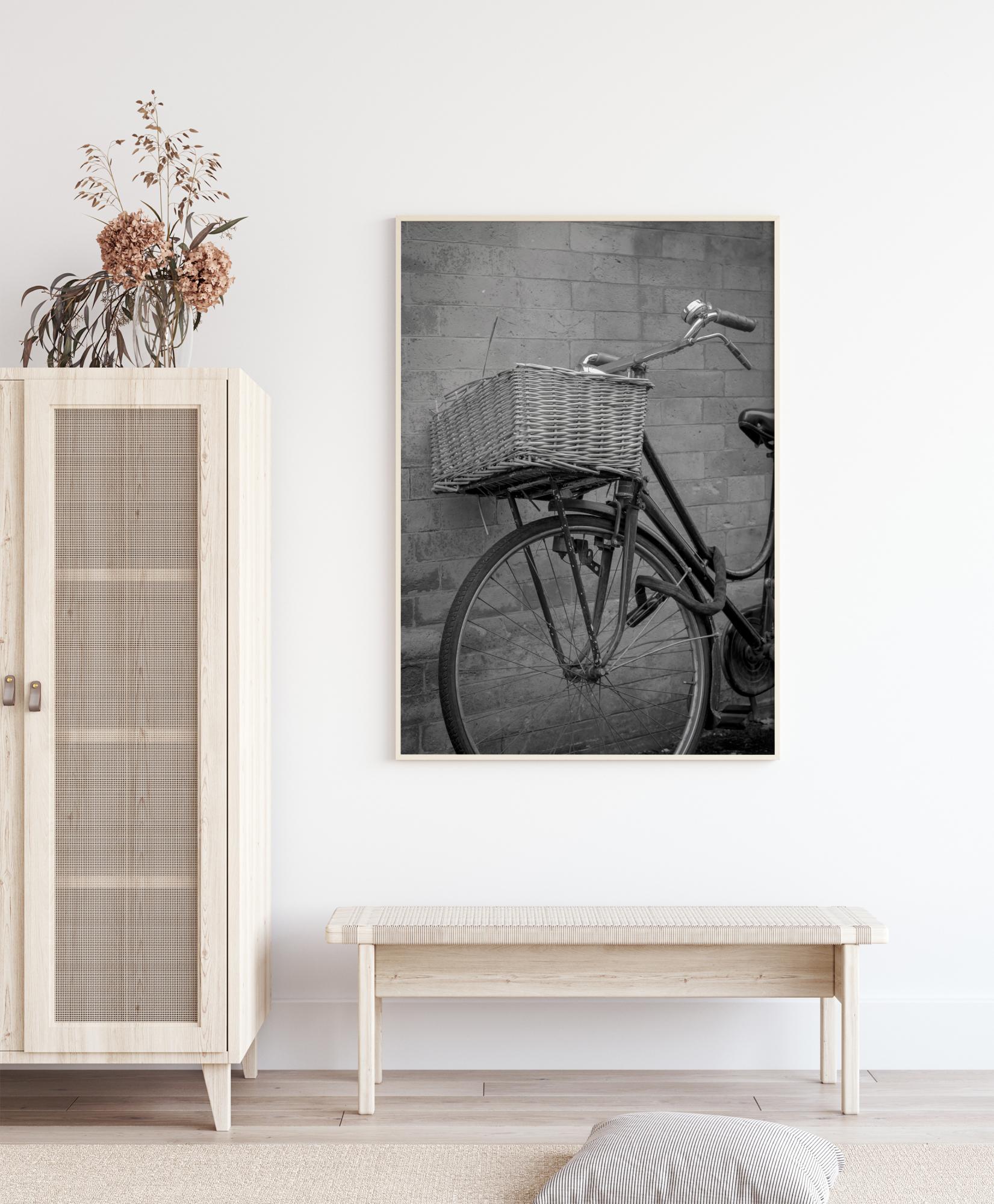 Csendélet poszter egy falnak támaszkodó biciklivel. A figyelem középpontjában a kerékpárkosár áll, és a kontrasztos fekete keret és biciklilakat vezeti a tekintetet a poszter körül. Akassza fel ezt az egyszerű, de elegáns képet egy világos falra stílusos hatásért.