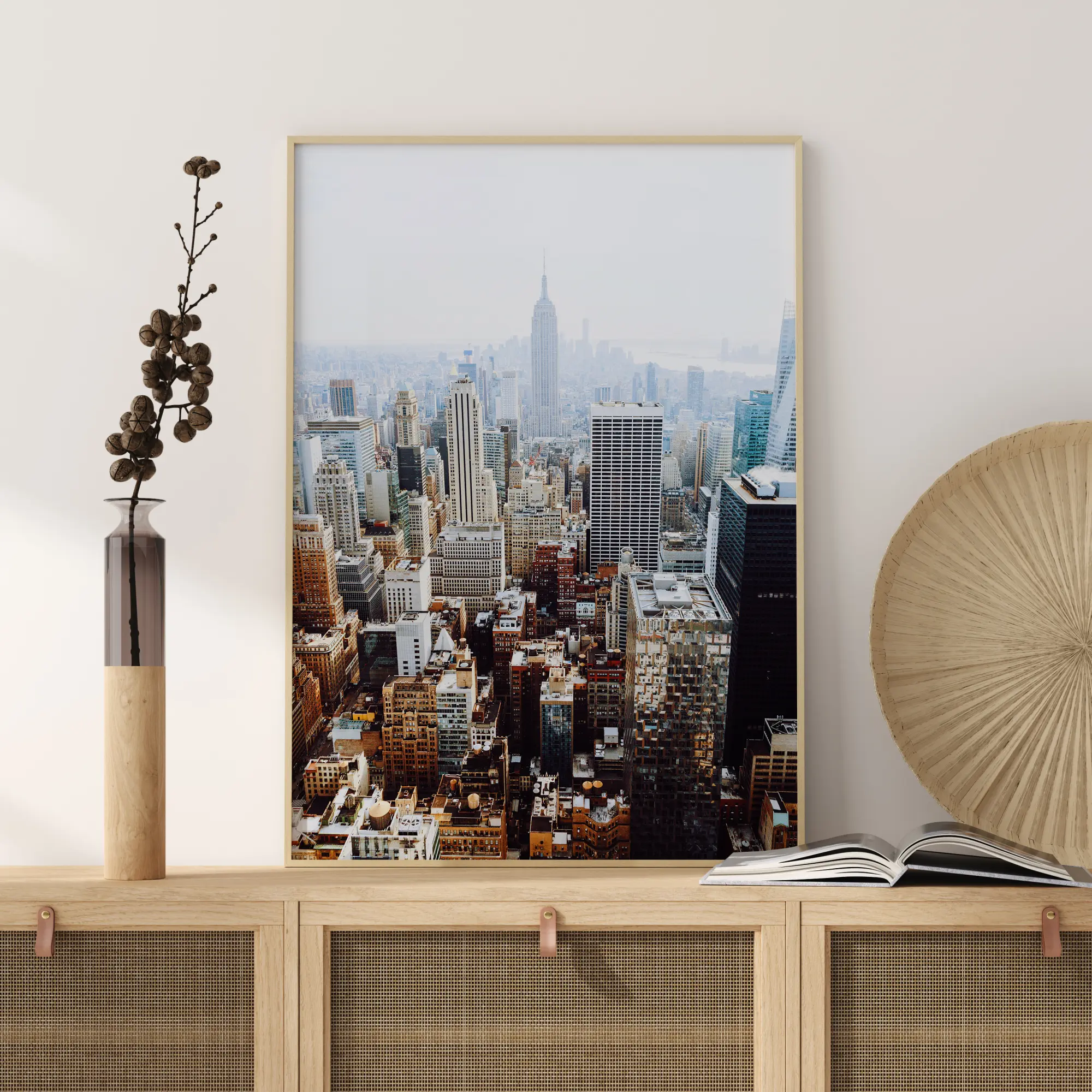 Egy légifelvételes poszter New York belvárosáról, a távolban az Empire State Buildinggel. Az előtérben a színek arany és sárga árnyalatokkal kezdődnek, mielőtt a háttérben hidegebb kék és szürke tónusokká válnának. A kép csökkenő fókusza adja meg a mélységet. Vigye haza ezt a művet, és élvezze a városi élet művészi kifejezésmódját.