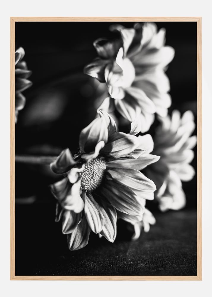 Ez a poszter egy fekete-fehér virágkompozíciót ábrázol, ahol az árnyékok és a fény együttműködnek, hogy kiemeljék minden egyes szirom finom körvonalait és textúráját. A kép fókusza a sötét és a világos közötti kontrasztra helyezkedik, megörökítve a virágok szépségét oly módon, ami új értékelést ad formájuk és szerkezetük számára. Ez a plakát a természet csodáinak kifinomult és művészi értelmezése, tökéletes a nyugalom és a szépség érzetének megteremtéséhez bármilyen térben.