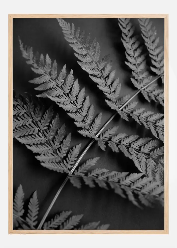 Ez a poszter a természet finom mintáinak tisztelgése, amely egy fekete-fehér képet mutat be páfránylevelekről. A finom részletek és az árnyjáték a levelek sziluettjei és a háttér között mélység és textúra érzetét keltik. Ez egy elegáns és kifinomult dekorációs elem, amely tökéletesen illeszkedik mind a modern, mind a hagyományos otthonokba.