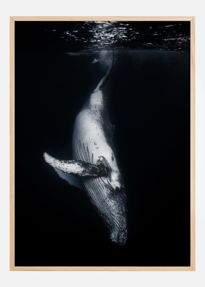 Ezen a poszteren egy púpos bálna látható, amint kecsesen siklik a sötét vízben. Egy olyan kép, amely megragadja a tengeri élet lényegét. A kontrasztos fekete-fehér kompozíció kiemeli a bálna texturált bőrét és testének elegáns körvonalait, ezzel erőteljes képet alkotva a nyugalomról és a kegyelemről a felszín alatt.