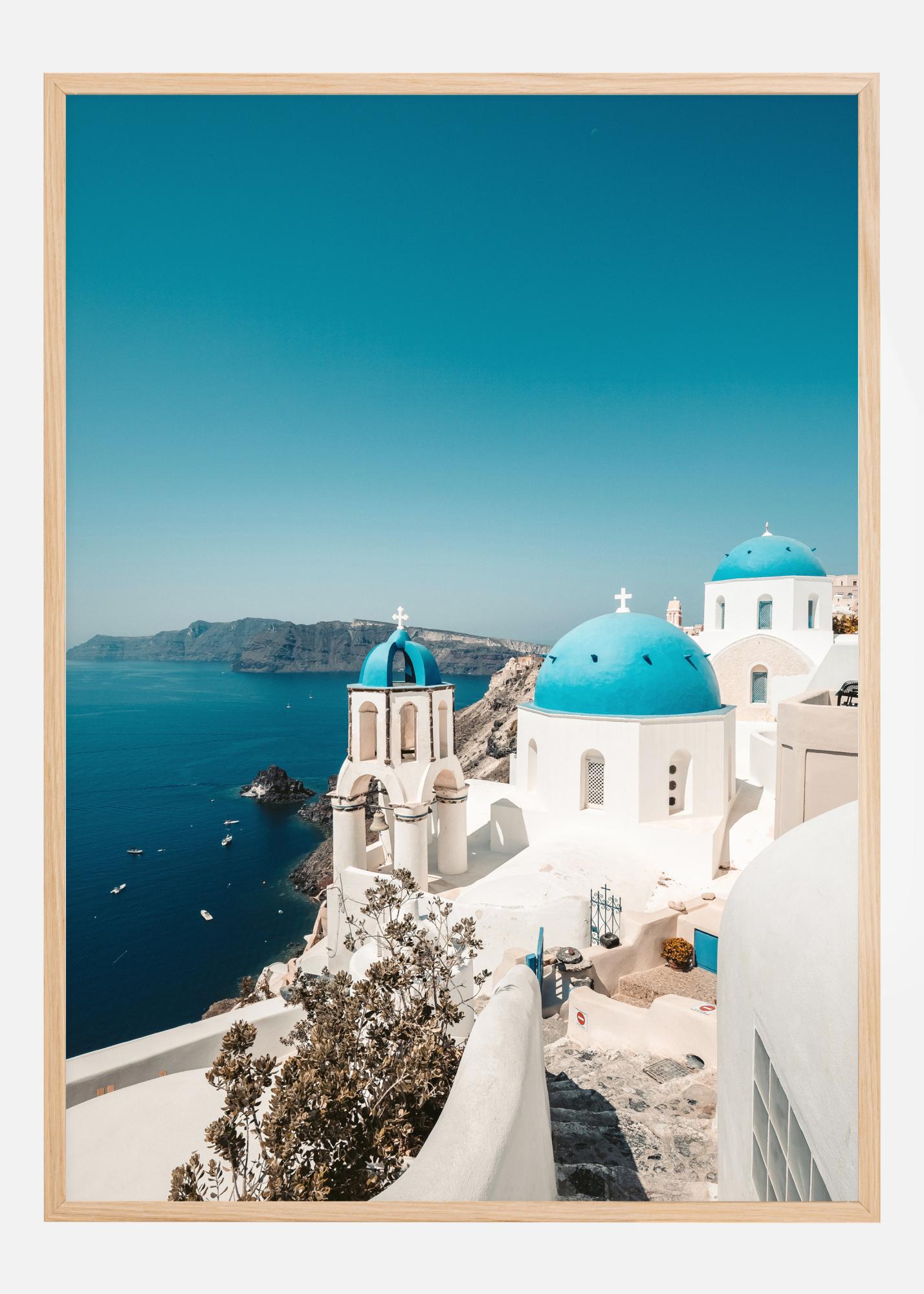 Egy világos poszter egy kis görög tengerparti várossal és a mélykék tengerrel. Minden épület fantasztikusan fehér, kék kupolákkal, amelyek illeszkednek a világoskék tengerhez és az éghez. Képzeld el, hogy ez az erkélyed és a kilátás az ablakodból, amikor ezt a képet a falra teszed otthon.