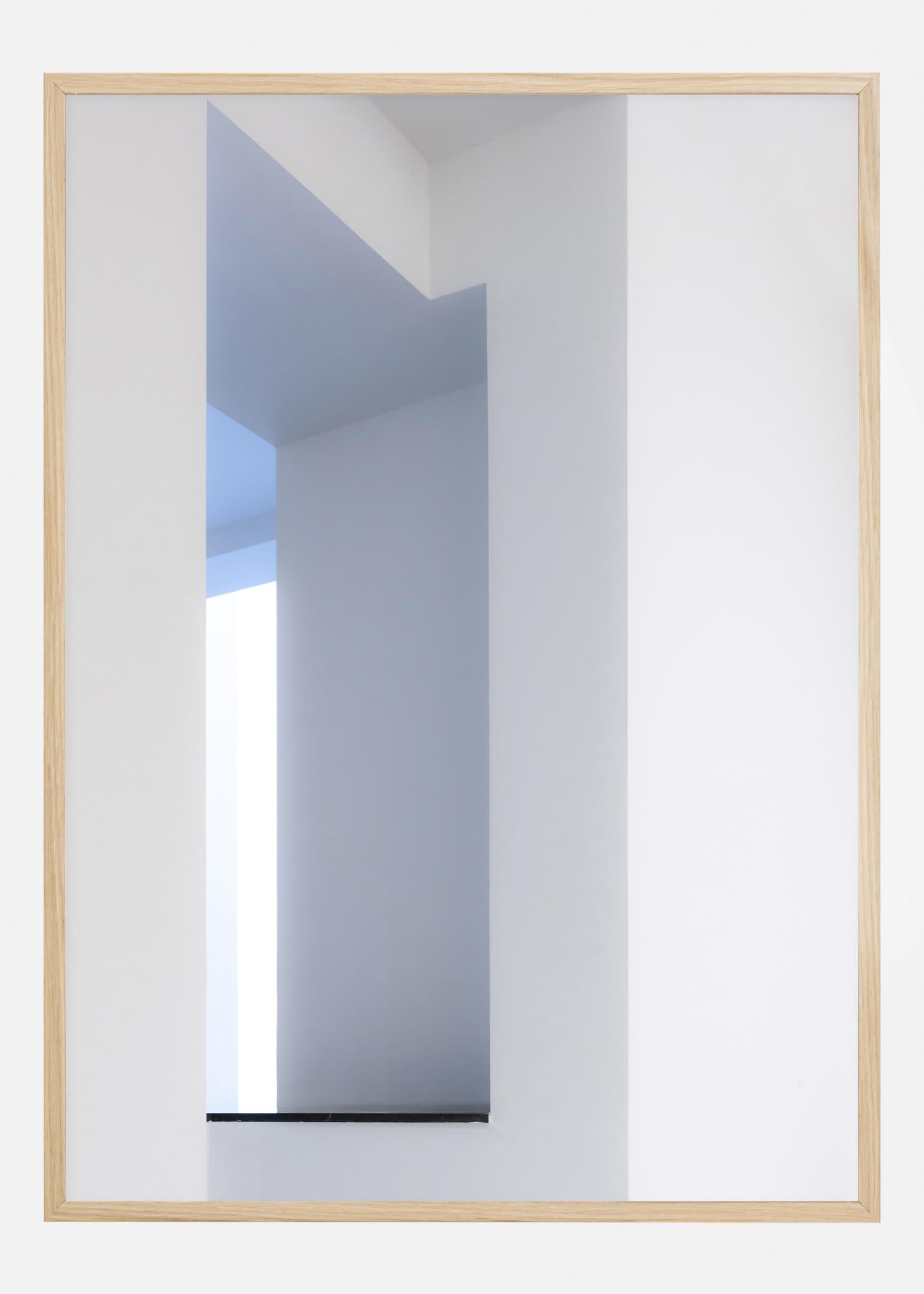 Egy belső poszter falakkal és ablakokkal. A fehér és szürke falak, valamint a geometriai formák az ablak felé vezetik a tekintetet, ahol a világos fehér fal és a kék ég van kívül. Akassza ezt a képet egy kissé sötétebb szobába, hogy megteremtse a fény és tér érzetét és illúzióját.