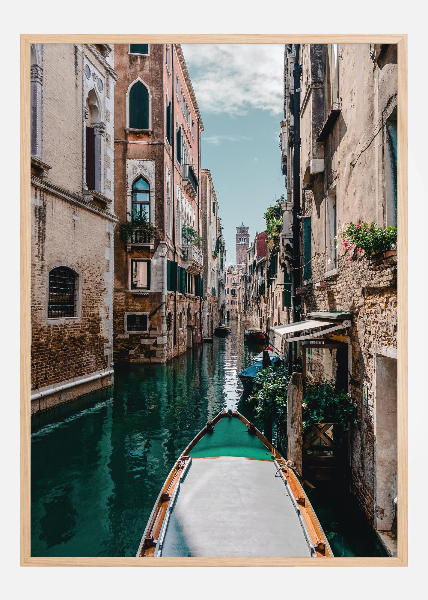 Ez a lenyűgöző poszter megragadja egy festői velencei csatorna lényegét, előtérben egy hagyományos gondolával. A fény szépen esik a környező épületek színes homlokzataira, és a nyugodt víz tükröződése egyaránt tiszta és elbűvölő tükröt hoz létre. Az épületek téglafalainak földszínű vörös és narancsszín árnyalatait a csatorna nyugodt, vízi kékeszöld színe ellenpontozza.