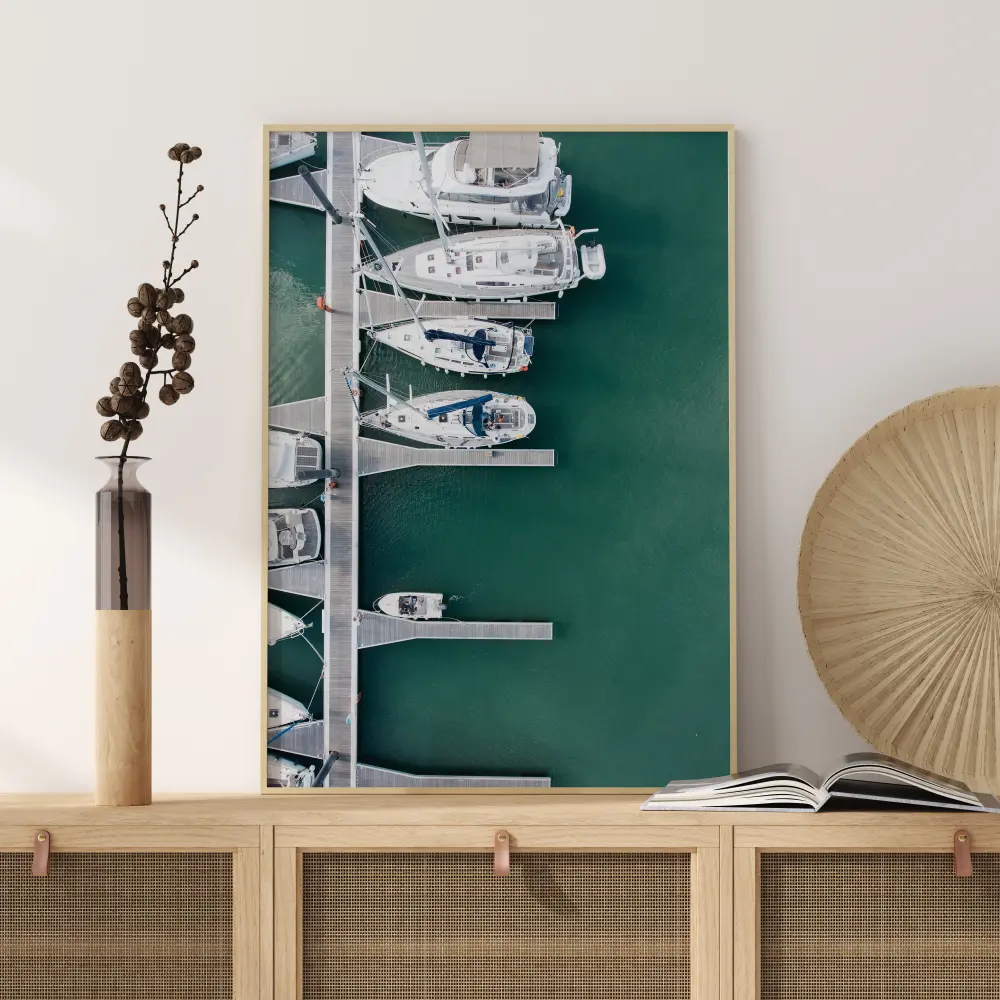Egy madártávlati nézetből készült poszter egy kikötőről és hajókról. A zöld víz a kikötő sétányához csapódik, ahol különböző hajók vannak kikötve. De nem minden hely foglalt, így néhány üres hely is marad. Élvezd ennek a légifotónak az egyszerűségét, amikor otthon felakasztod.