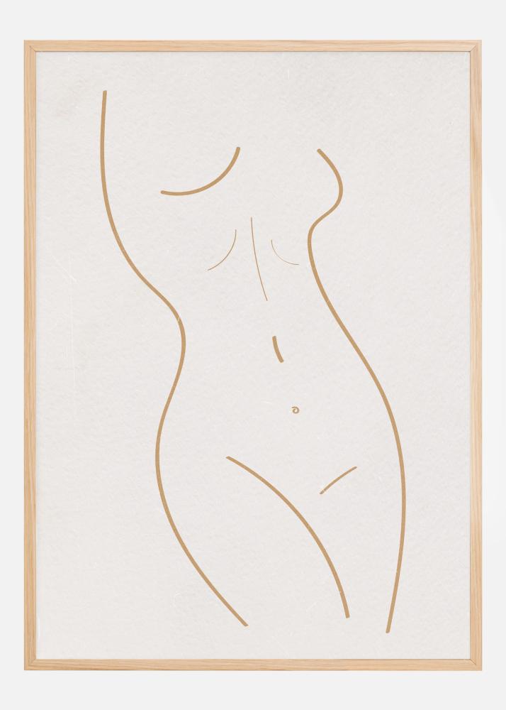 Egy poszter egy nőről barna vonalakkal. Erős, merész barna vonalak körvonalazzák a nő lábát, hasát és mellét. A vonalak egyenletesek és felfelé ívelnek ebben az elegáns rajzban. Akassza fel ezt a művet egy egyszerű fehér falra, hogy galériaérzetet keltsen.