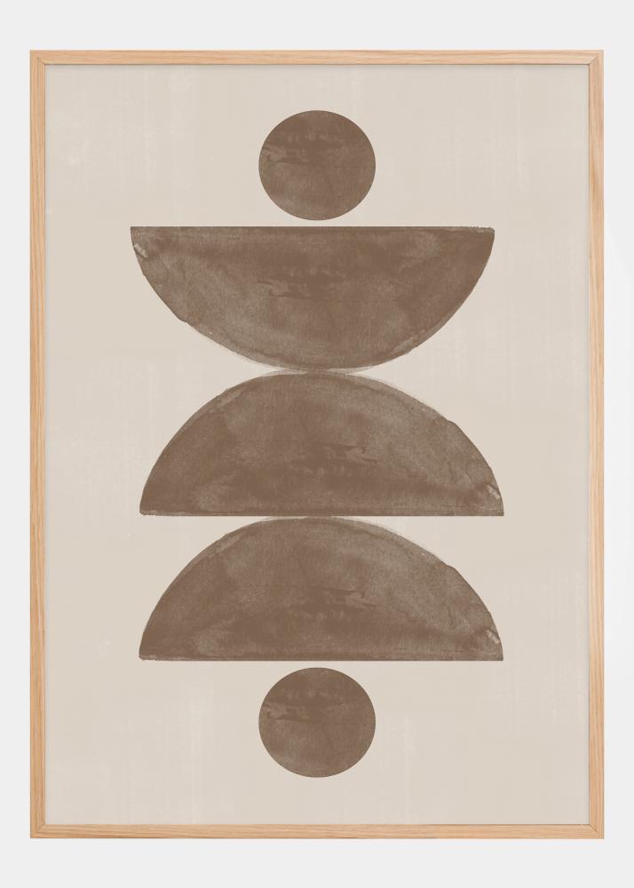 Ez a nyugtató és esztétikailag kielégítő poszter puha geometriai formák harmonikus elrendezését mutatja be. Két félig hold földes barna tónusban kiegyensúlyozva van két teljes körrel, szimmetrikusan elhelyezve felette és alatta. Ez a minimalista kompozíció nyugalom érzést nyújt, és tökéletesen képviseli a bohémi stílust puha és modern vonzerővel.