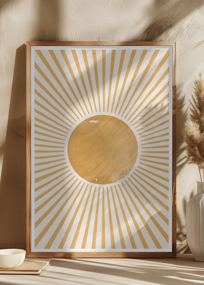 Ezt az élénk posztert a sugárzó nap érzésének keltésére tervezték, aranyszínű vonalakat sugározva, amelyek egy központi sárga kört ölelnek körül egy lágy fehér háttér előtt. A dizájnt bohém és geometriai minták inspirálták, amelyek együtt a nap melegének és energiájának képét teremtik meg. A meleg színek és a sugárzó minta célja, hogy öröm és pozitivitás érzését keltse.