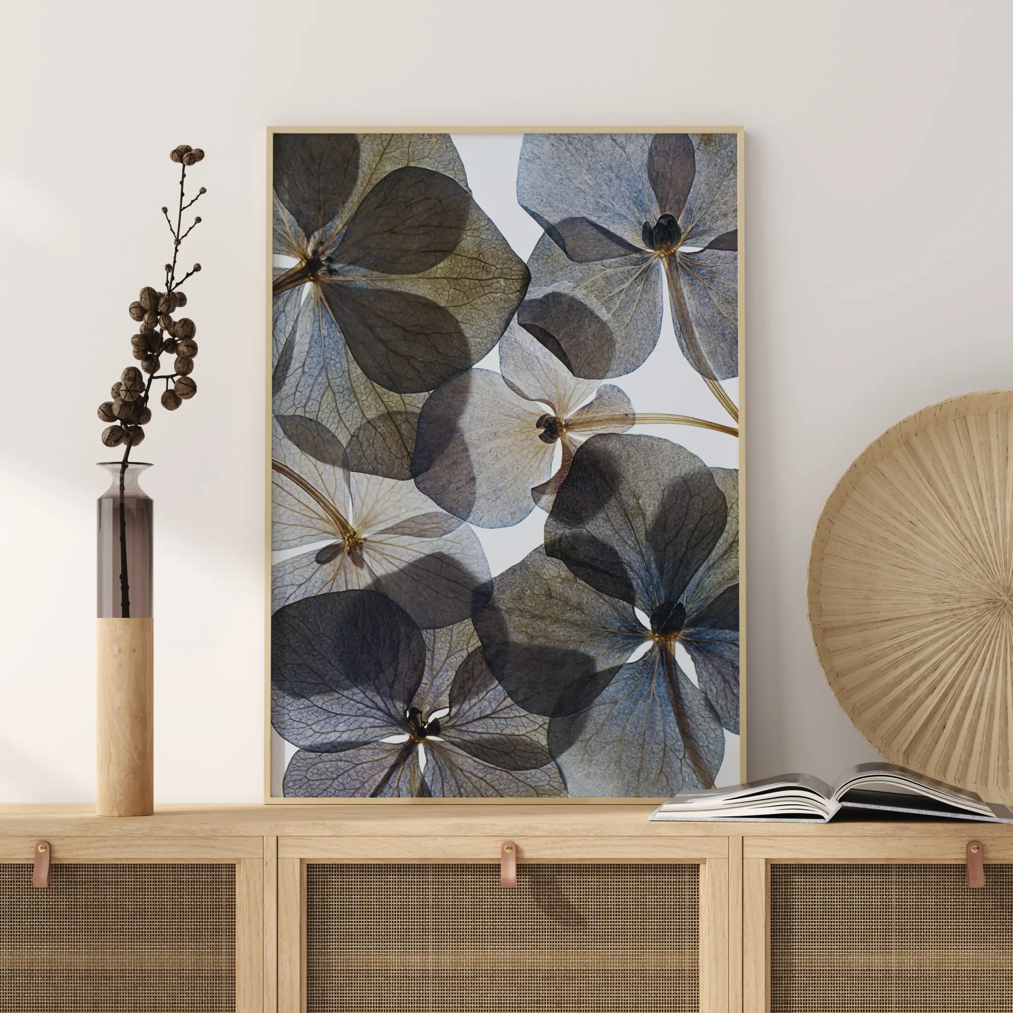 Egy botanikai poszter tele átlátszó kék és barna virágokkal. A háttérből érkező fehér fény átsüt ezeken a szirmokon, amelyek közül néhány átfedi egymást, így sötétebbé válik. Akaszd fel ezt a művet és képzeld el, hogy ezek alatt a csodálatos, széles szirmok alatt állsz, hogy egy nyugodt légkör vegyen körül.