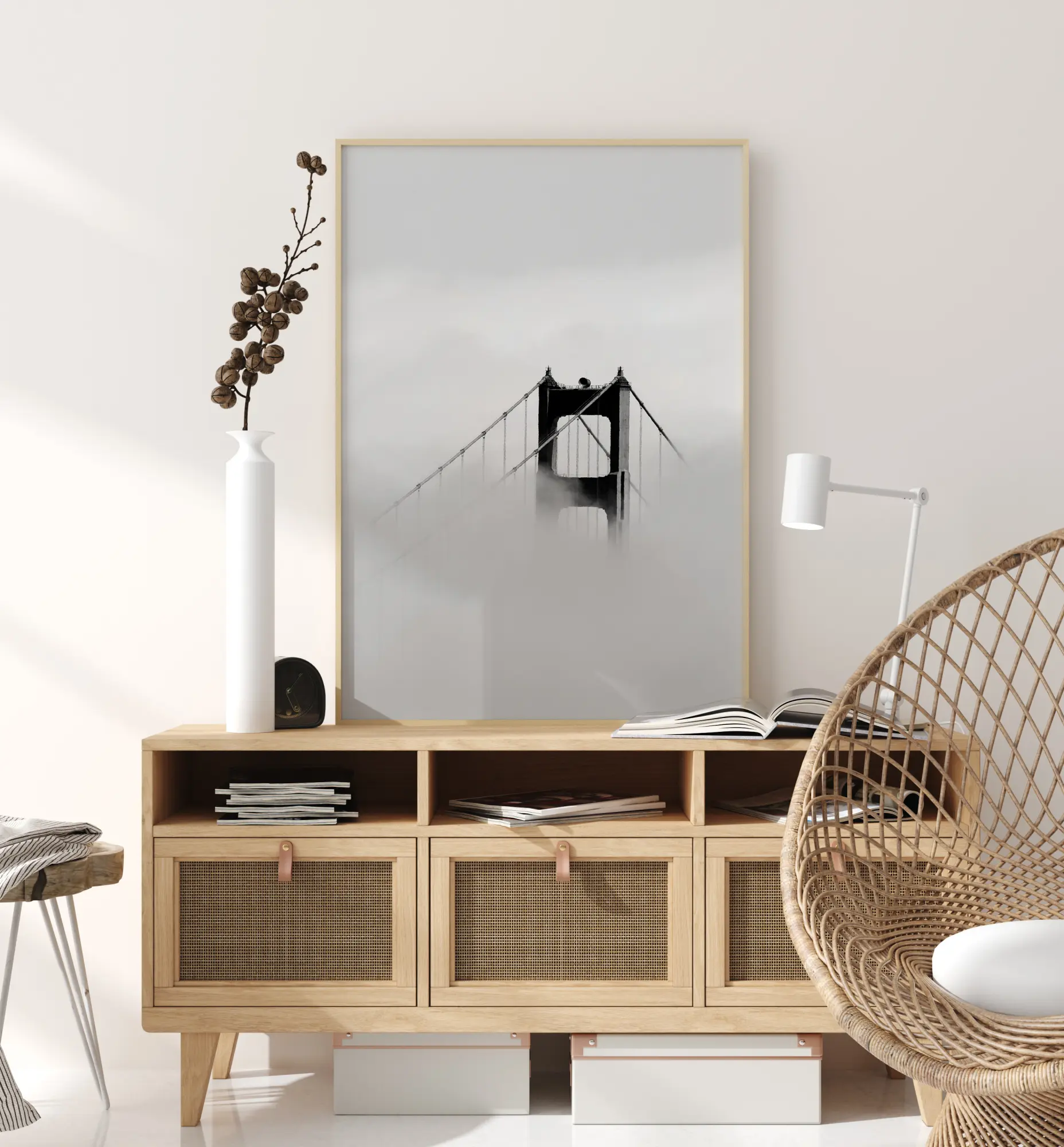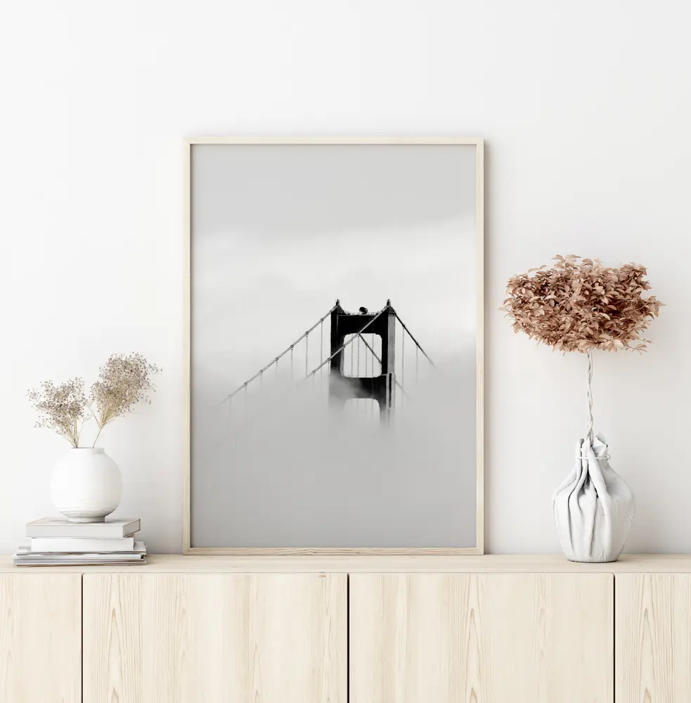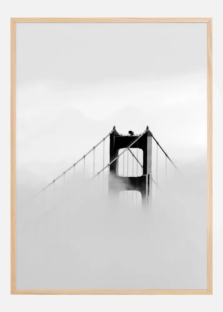 Egy drámai poszter egy híd tetejéről. A köd felszáll és elrejti az egész hidat, kivéve a tetejét. Fekete és masszív, a híd felemelkedik a felhős égbolt és a lent lévő köd között. Élvezze ezt a csodálatos képet, amikor ez a poszter a falán van.
