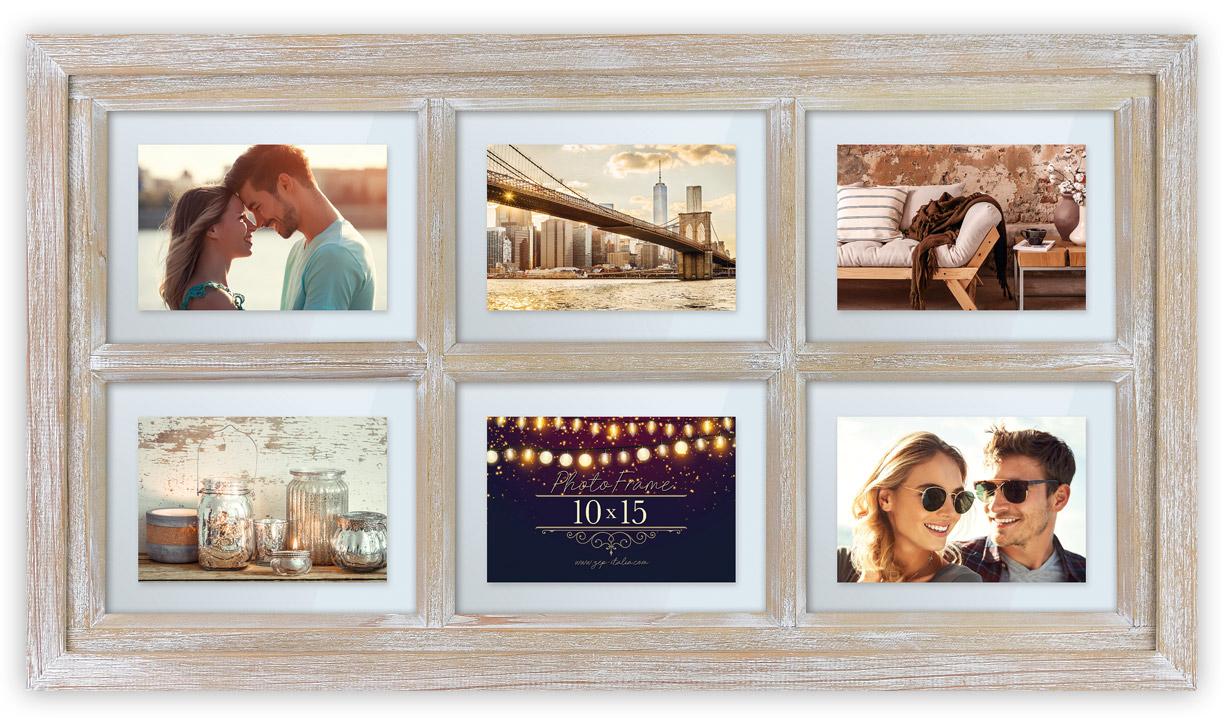 Fekvő kollázskeret világos fából. Ez egy keret, amely 6 darab 10x15 cm-es méretű fényképet tartalmaz, és lehetővé teszi, hogy egyszerűen rendezd el a képek csoportját egy szép módon. A keret fa erezete rusztikus, mégis vidéki jelleget kölcsönöz neki. A keret külső méretei 38,5x69,5 cm. Fali akasztóval rendelkezik.