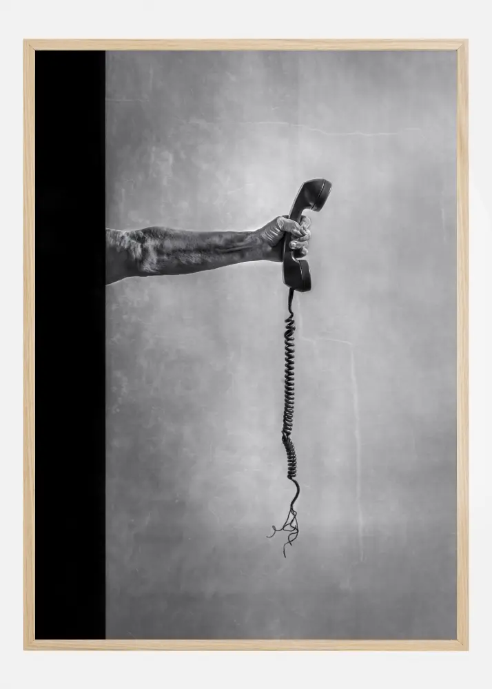 Egy fekete-fehér poszter egy karral, amely egy telefonkagylót tart, levágott vezetékkel. Az erős kar a kép közepén tartja a telefont. A fekete telefon és a vezeték egy szürke háttér felé lóg. Kihez van a telefon kinyújtva? Lazítson, és engedje be ezt a képet, amíg otthonában lóg.