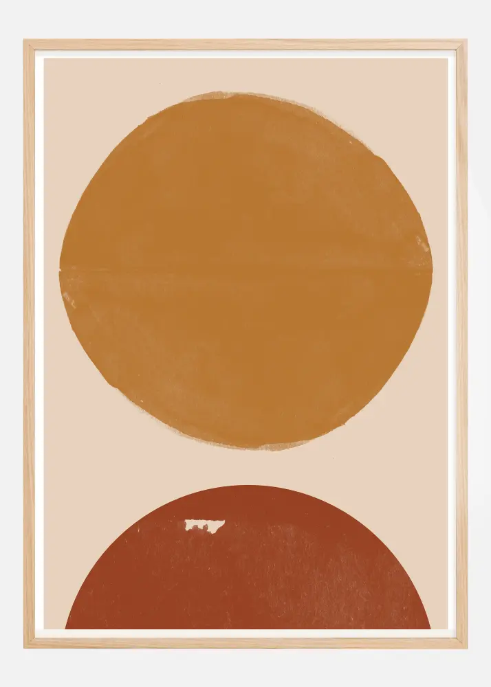 Ezzel az egyszerűséggel és mélységgel ez az absztrakt poszter megragadja a modern esztétika lényegét. Két átfedő, organikus forma égett narancssárga és mélyvörös tónusokban egy olyan figyelemfelkeltő motívumot hoz létre, amely egyszerre időtlen és kortárs. A nagy, felső forma úgy tűnik, mintha az alsó felett lebegne, ezzel dimenzió és mélység érzetét keltve a minimalista kivitel ellenére. Ez egy olyan nyomat, ami ígéret szerint beszédtémává válik bármely szobában, ahová elhelyezik.