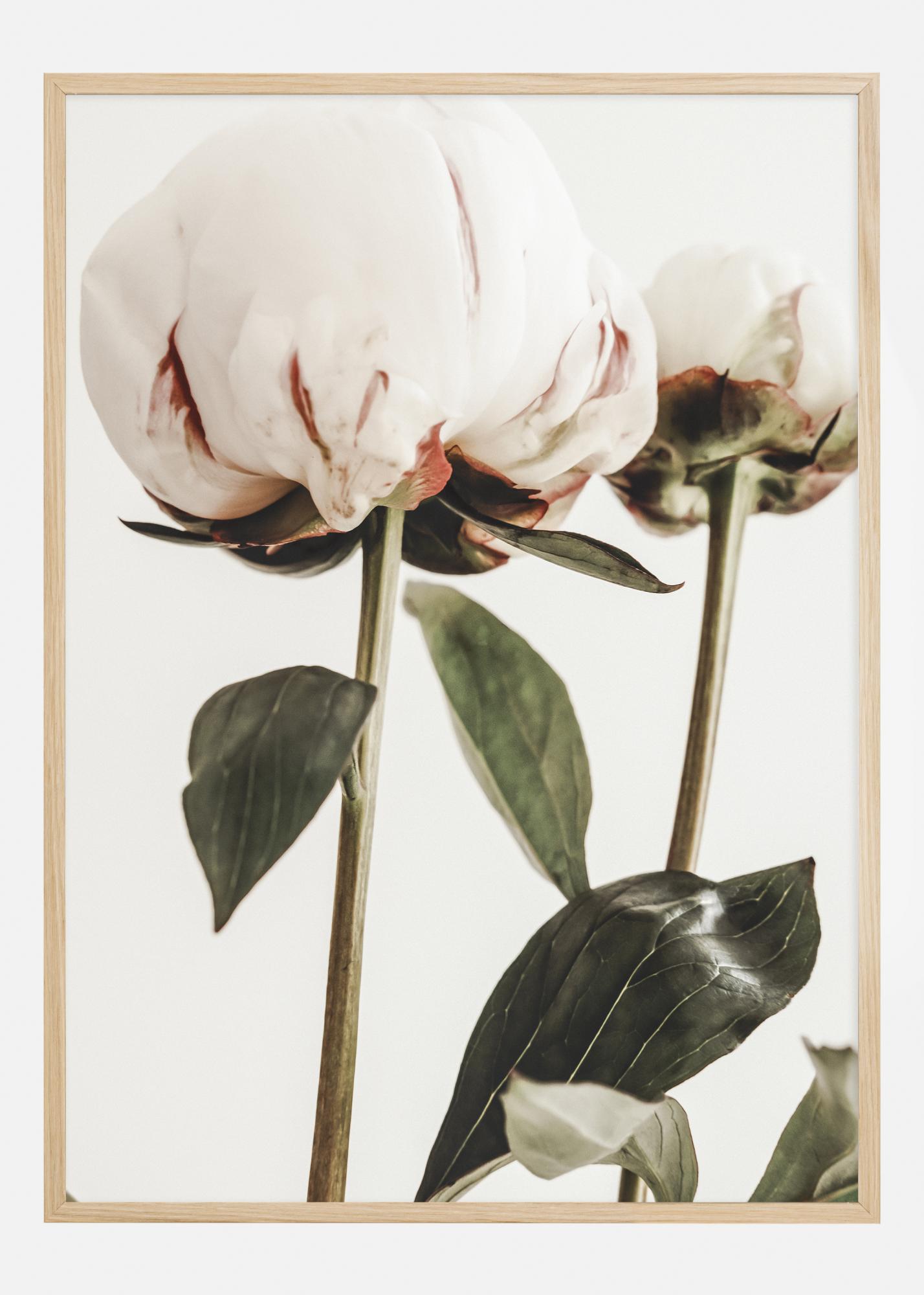 Ez a poszter a teljes pompában lévő pünkösdi rózsák páratlan szépségét örökíti meg. A nagy, bolyhos virágok, lágyan hajtogatott szirmaikkal a fehér és rozsda árnyalataiban, büszkén állnak erős szárukon. A mélyzöld levelek erőteljes hátteret képeznek, amely kiemeli a virágok finom szerkezetét és gazdag színárnyalatait.